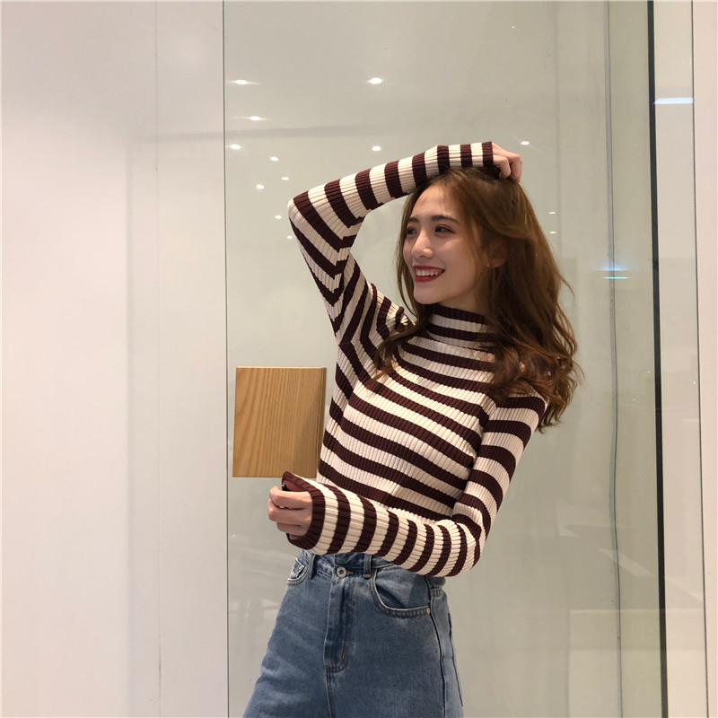 / 慵懶風套頭毛衣女2018新款秋冬修身顯瘦高領條紋加厚打底針織衫女