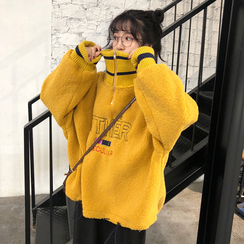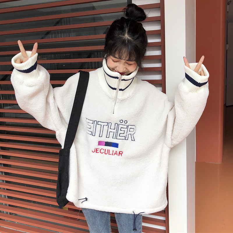 秋冬女裝2018新款慵懶風羊羔毛高領衛衣韓版字母長袖外套時尚上衣