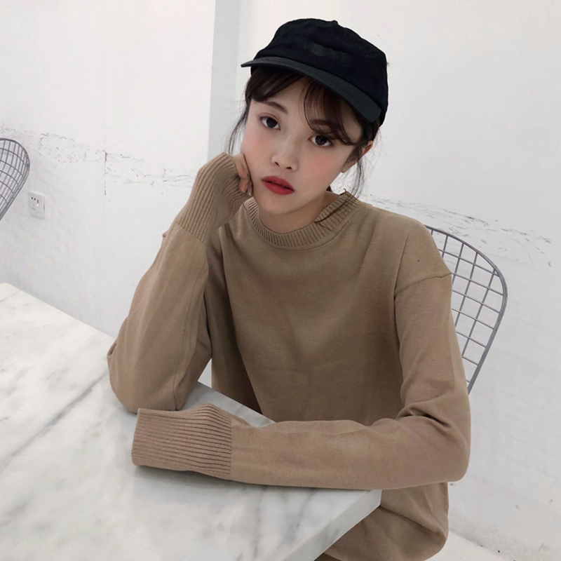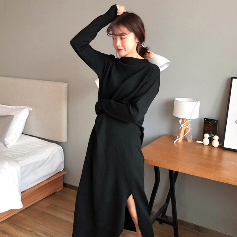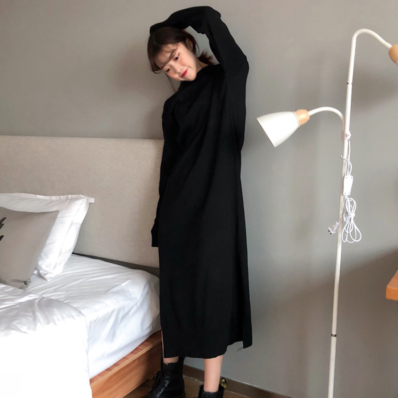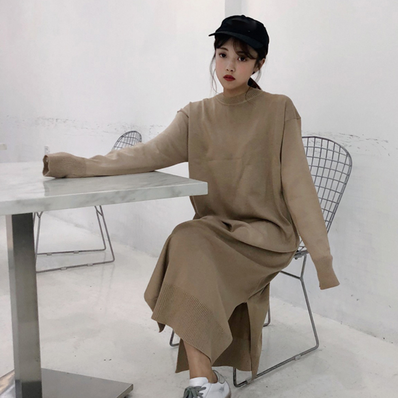 / 簡約慵懶風針織裙女秋裝新款圓領寬松長袖連衣裙學生休閑中長裙子