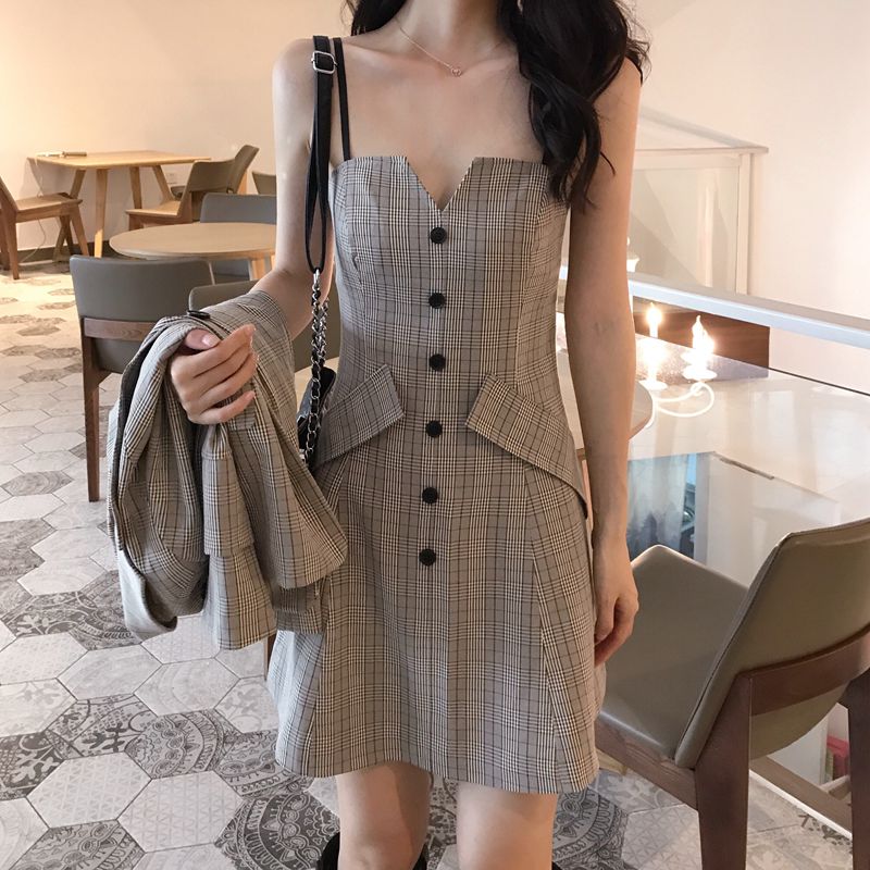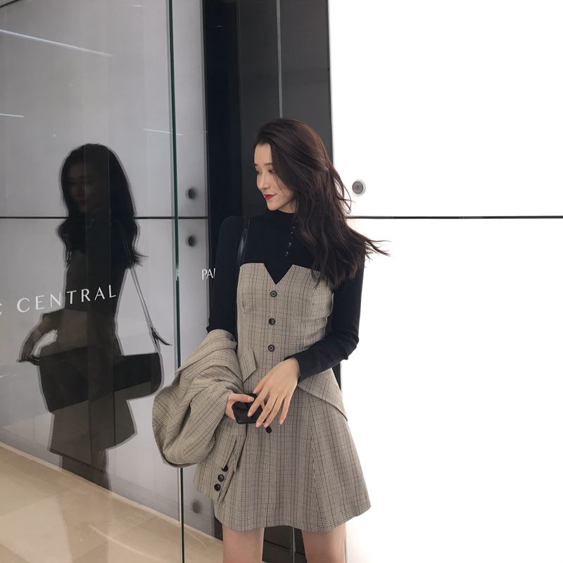 內搭一件吊帶裙,平領下做了一個極為顯瘦的V領