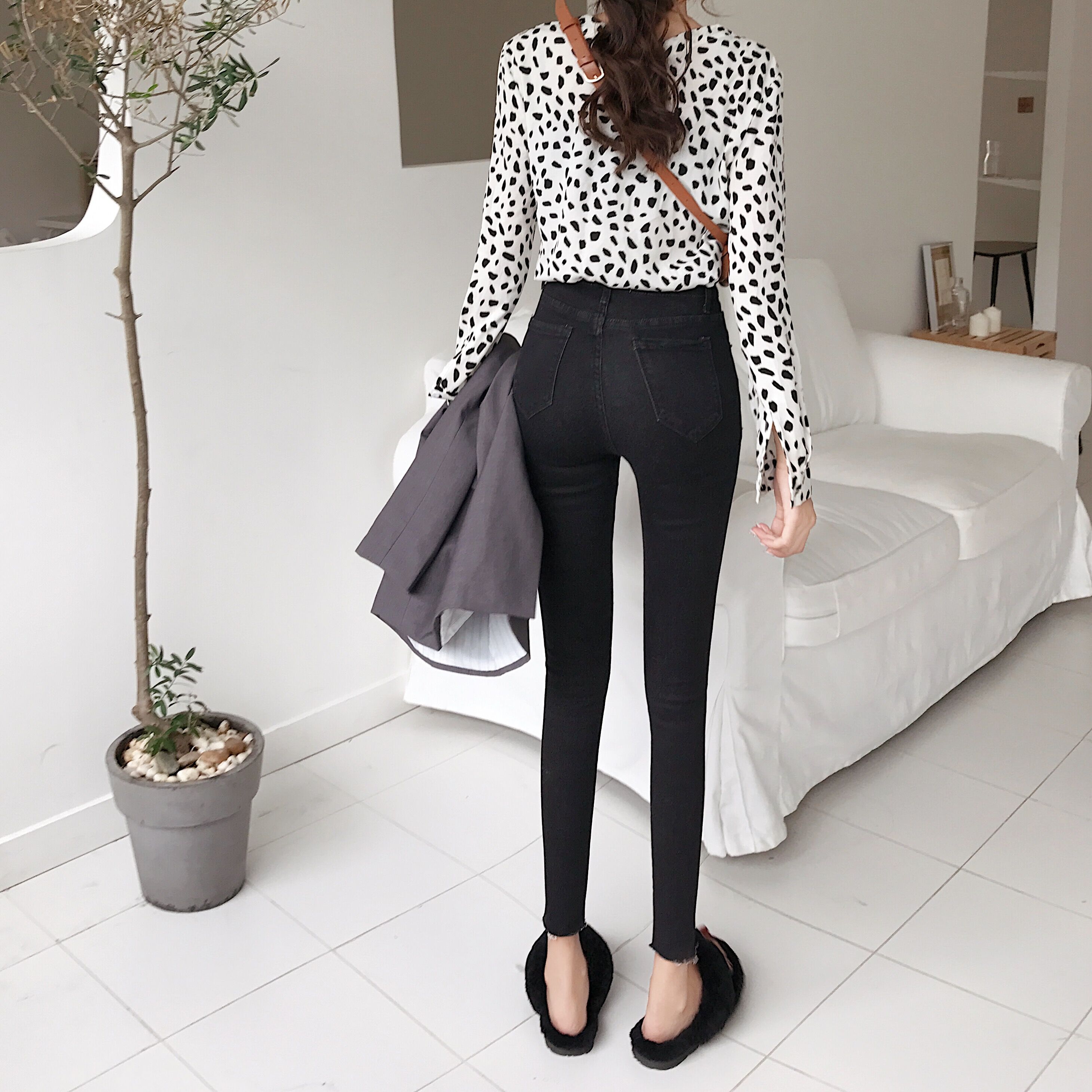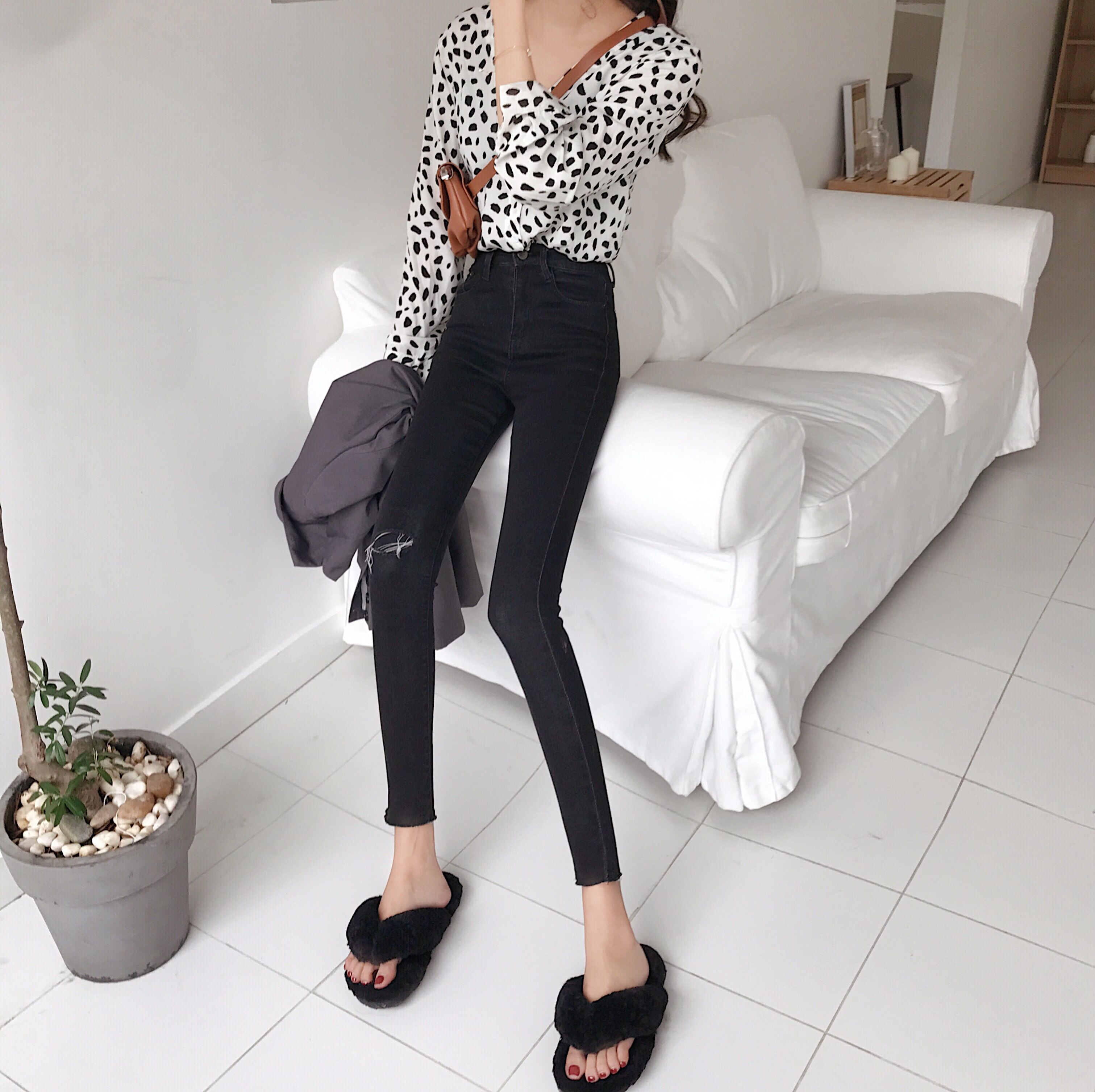 韓國高腰chic破洞牛仔褲女秋冬2018新款彈力顯瘦修身小腳鉛筆褲潮