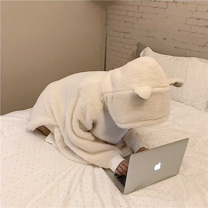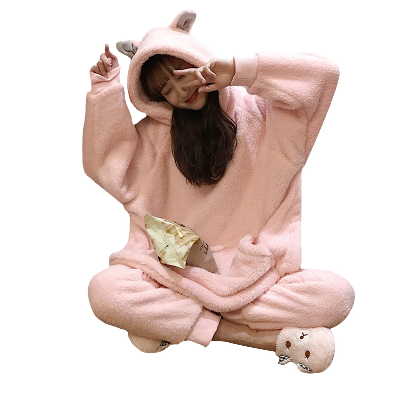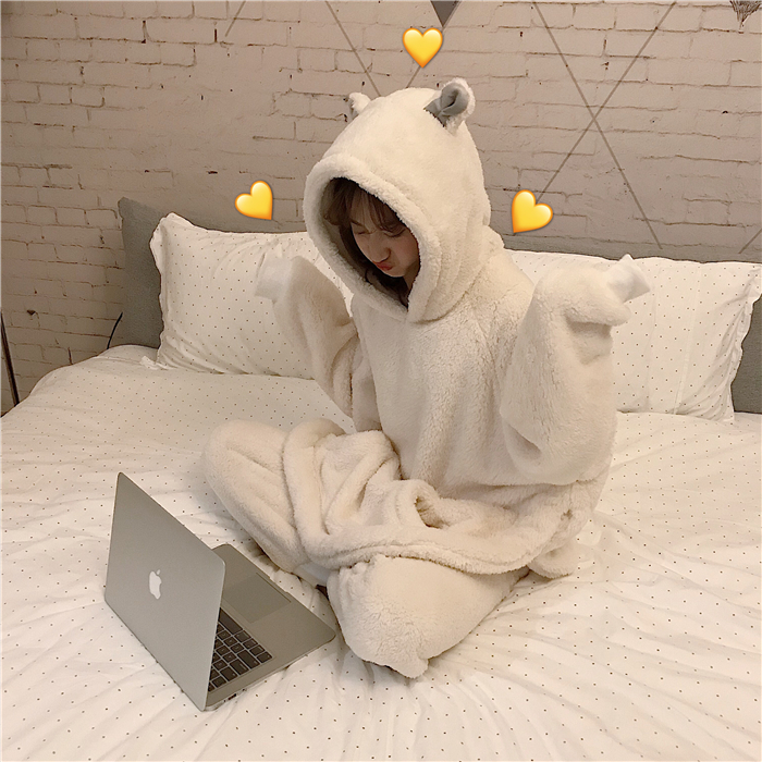 / 秋冬女裝韓版甜美可愛毛毛絨兔耳朵長袖睡衣睡褲兩件套家居服套裝