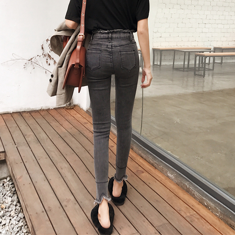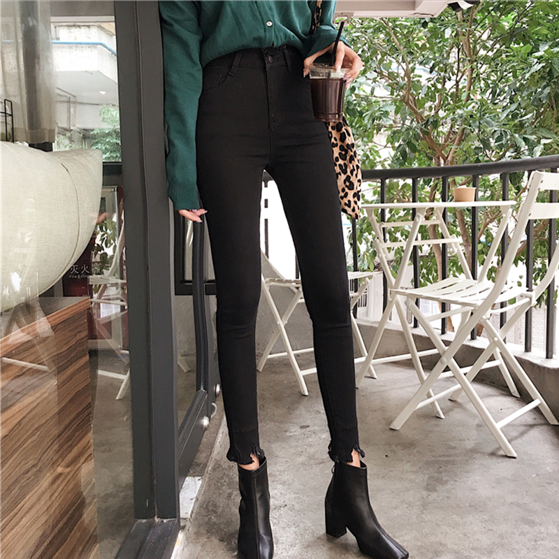 / 秋裝新款不規則毛邊時尚小腳鉛筆褲女修身顯瘦高腰彈力緊身牛仔褲