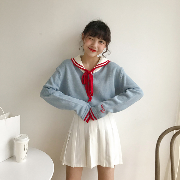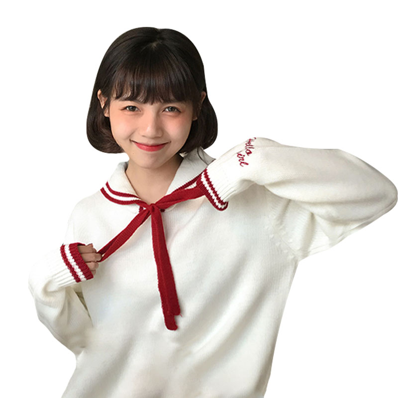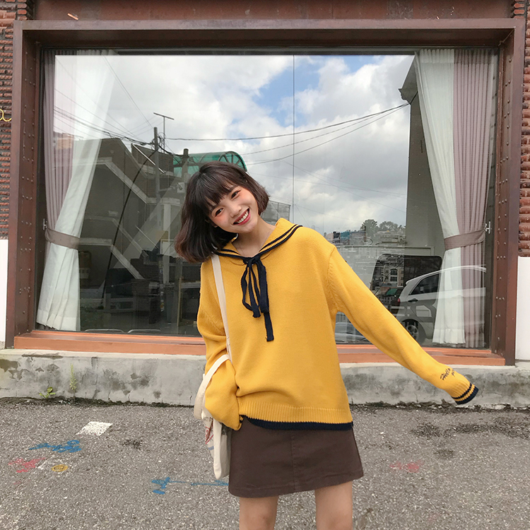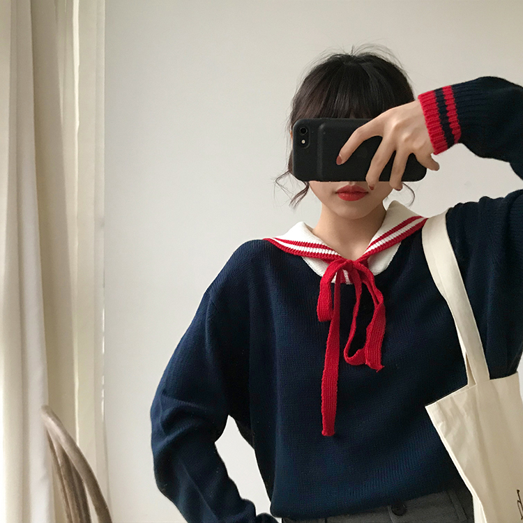 / 秋季女裝韓版甜美學院風寬松系帶軟妹可愛網紅套頭毛衣針織衫上衣