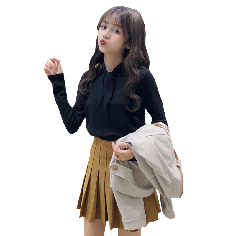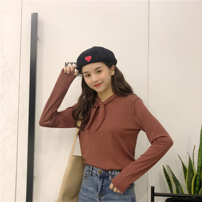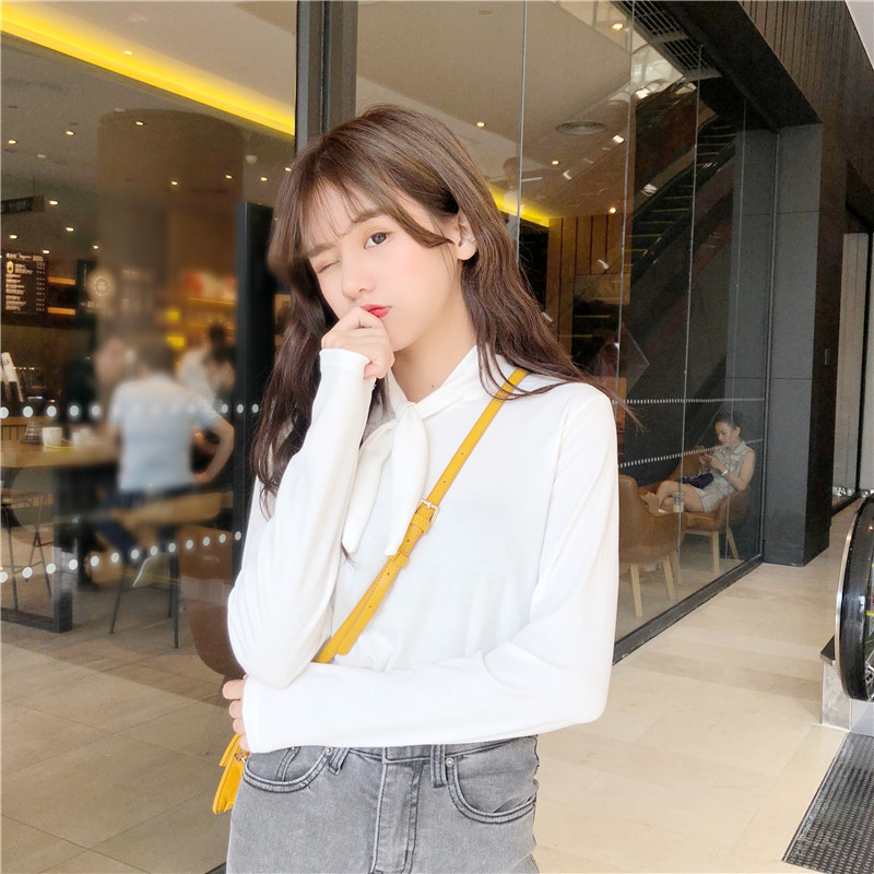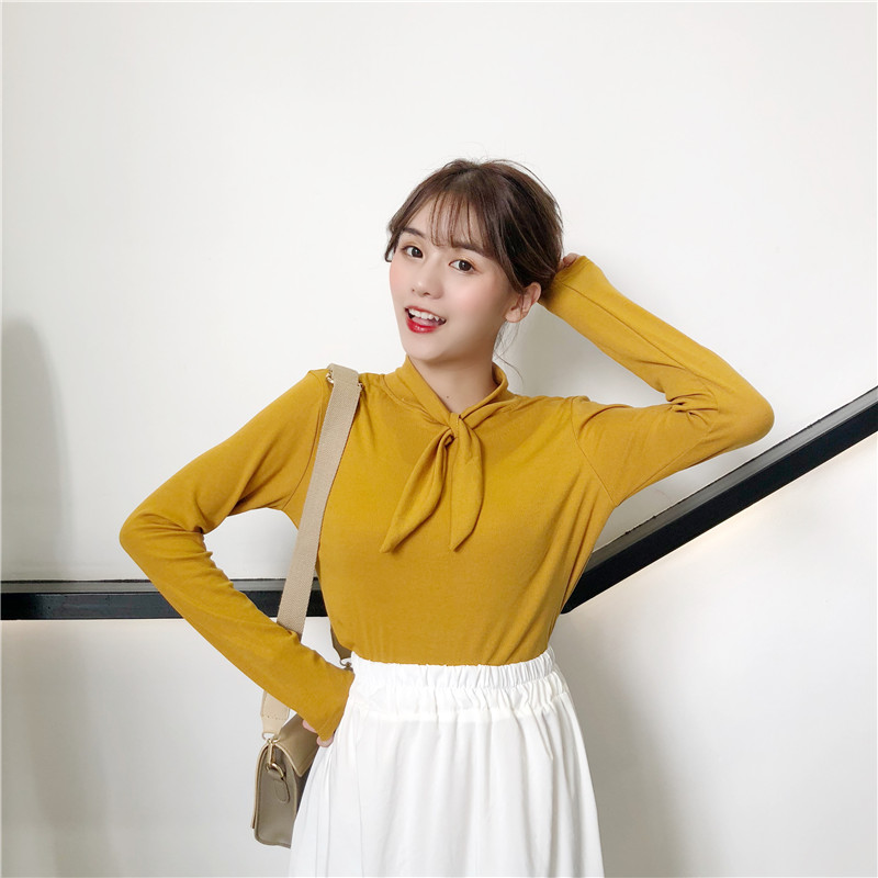 / 秋裝韓版chic套頭領結純色外搭內穿長袖修身顯瘦打底衫T恤上衣女