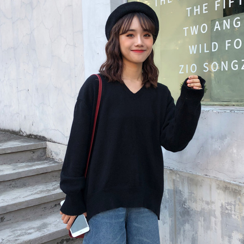 秋冬女裝2018新款韓版純色長袖套頭針織衫學生寬松V領毛衣外套潮