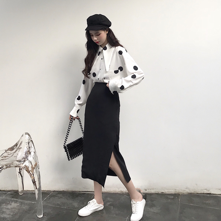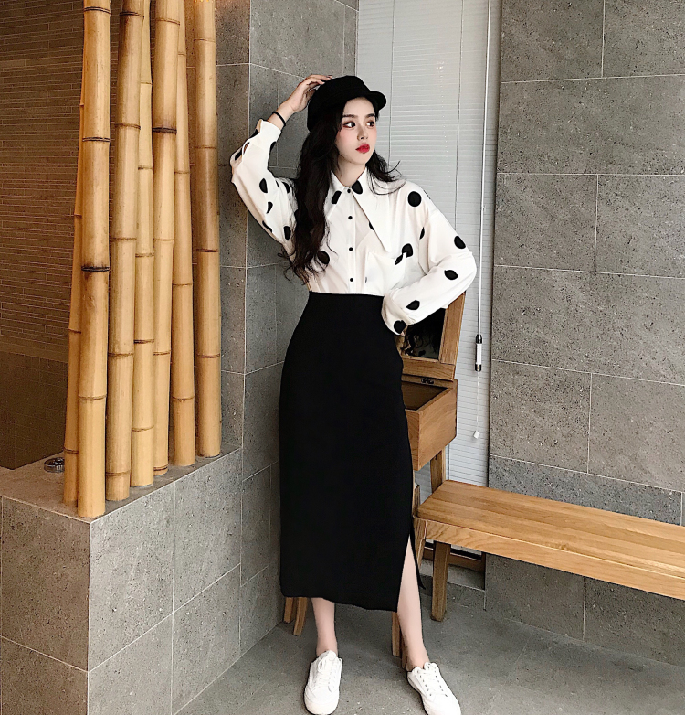 早秋chic港味波點印花長袖襯衫極簡長款側邊開叉A字裙女時尚套裝