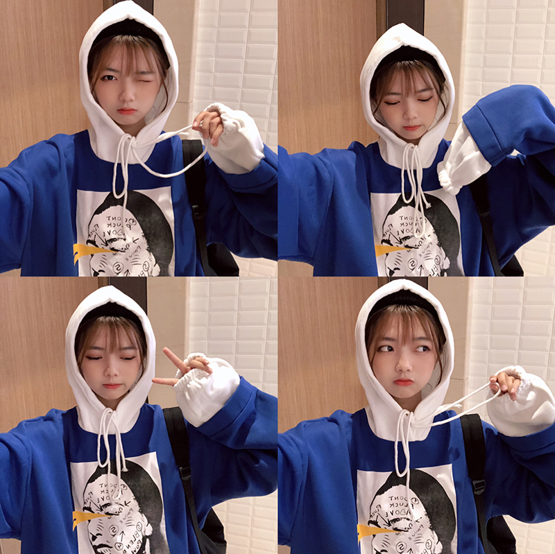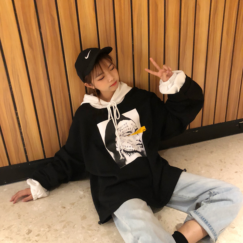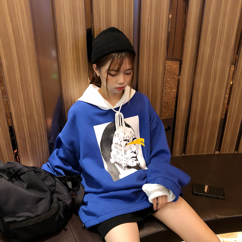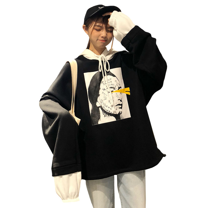 / 秋冬韓版中長款寬松原宿風人物假兩件加絨加厚連帽衛衣上衣外套女