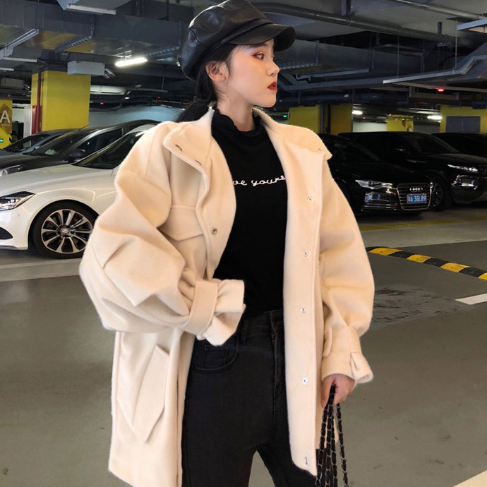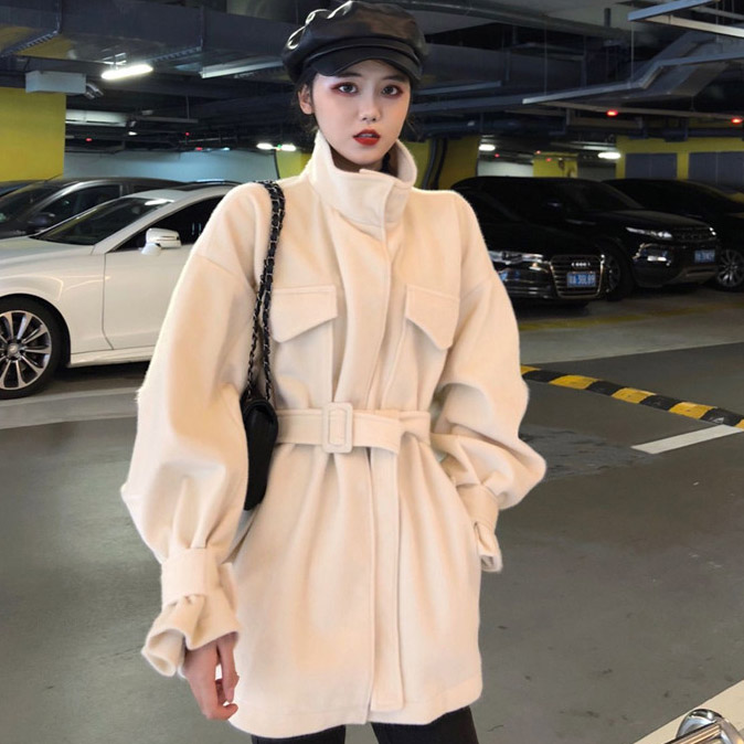 冬裝新款chic風復古韓版慵懶寬松加厚千鳥格毛呢外套女上衣配腰帶
