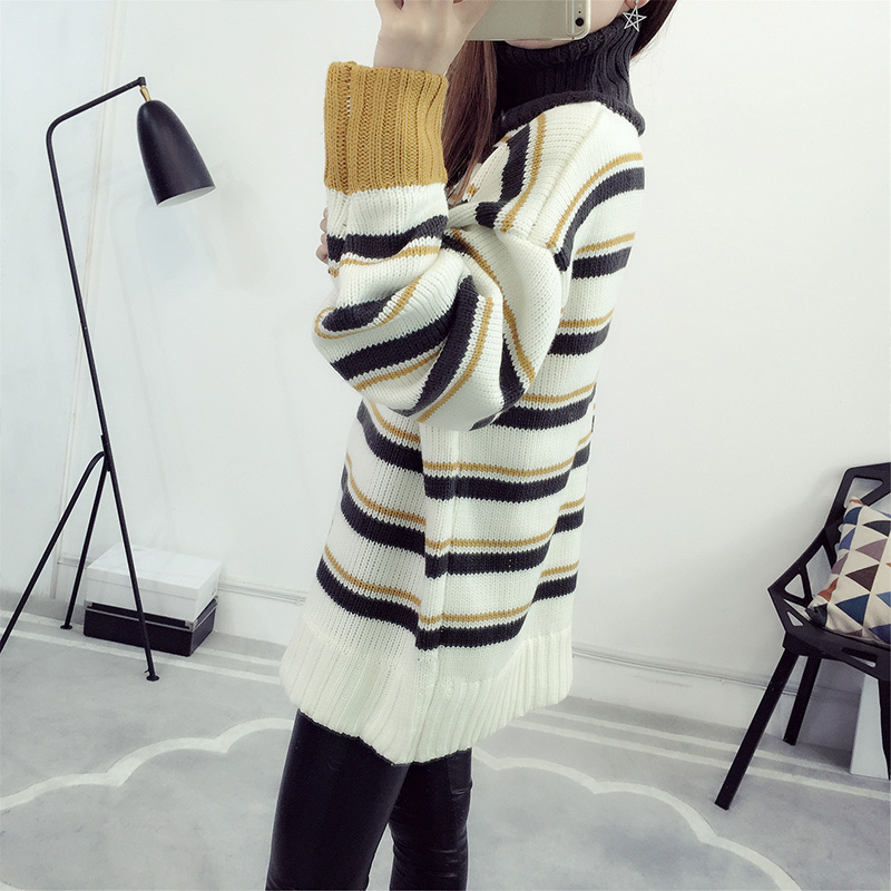 套頭毛衣女秋冬韓版寬松中長款條紋針織衫外套女裝秋裝新款潮