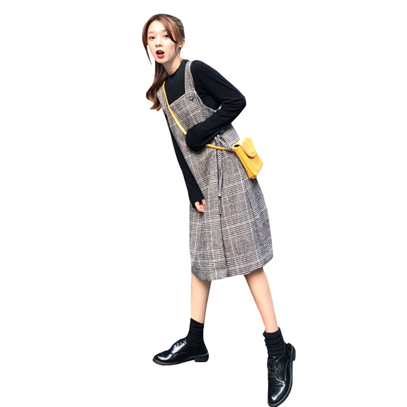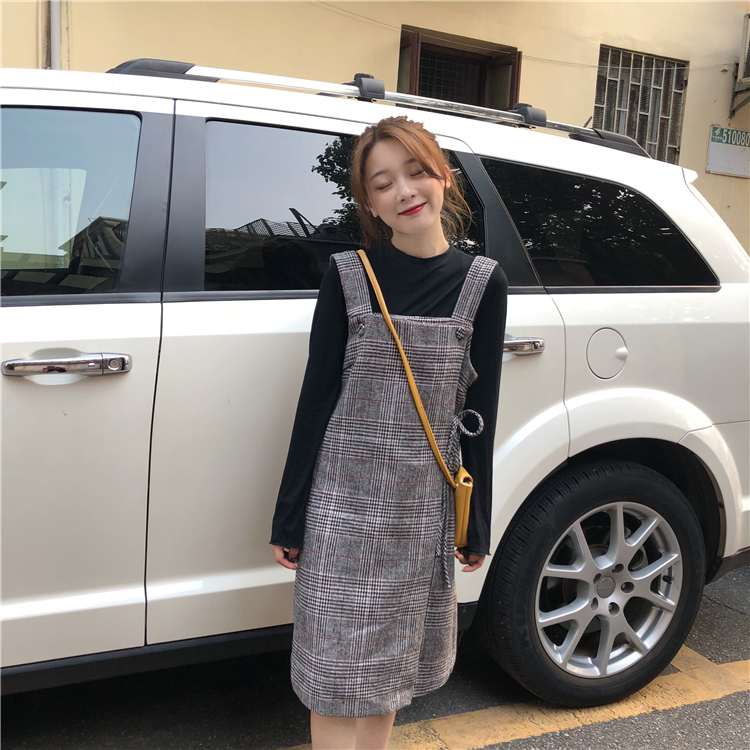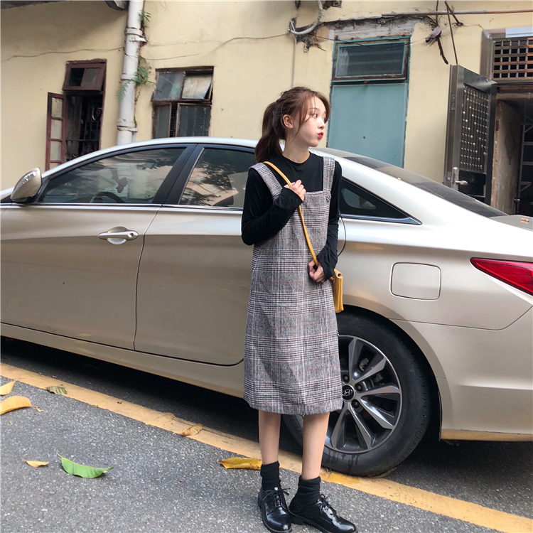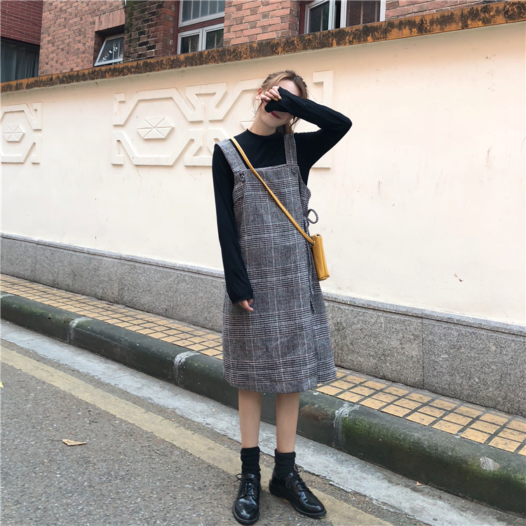 2018新款秋冬女裝韓版chic復古格子呢子格子背帶裙連衣裙顯瘦裙子