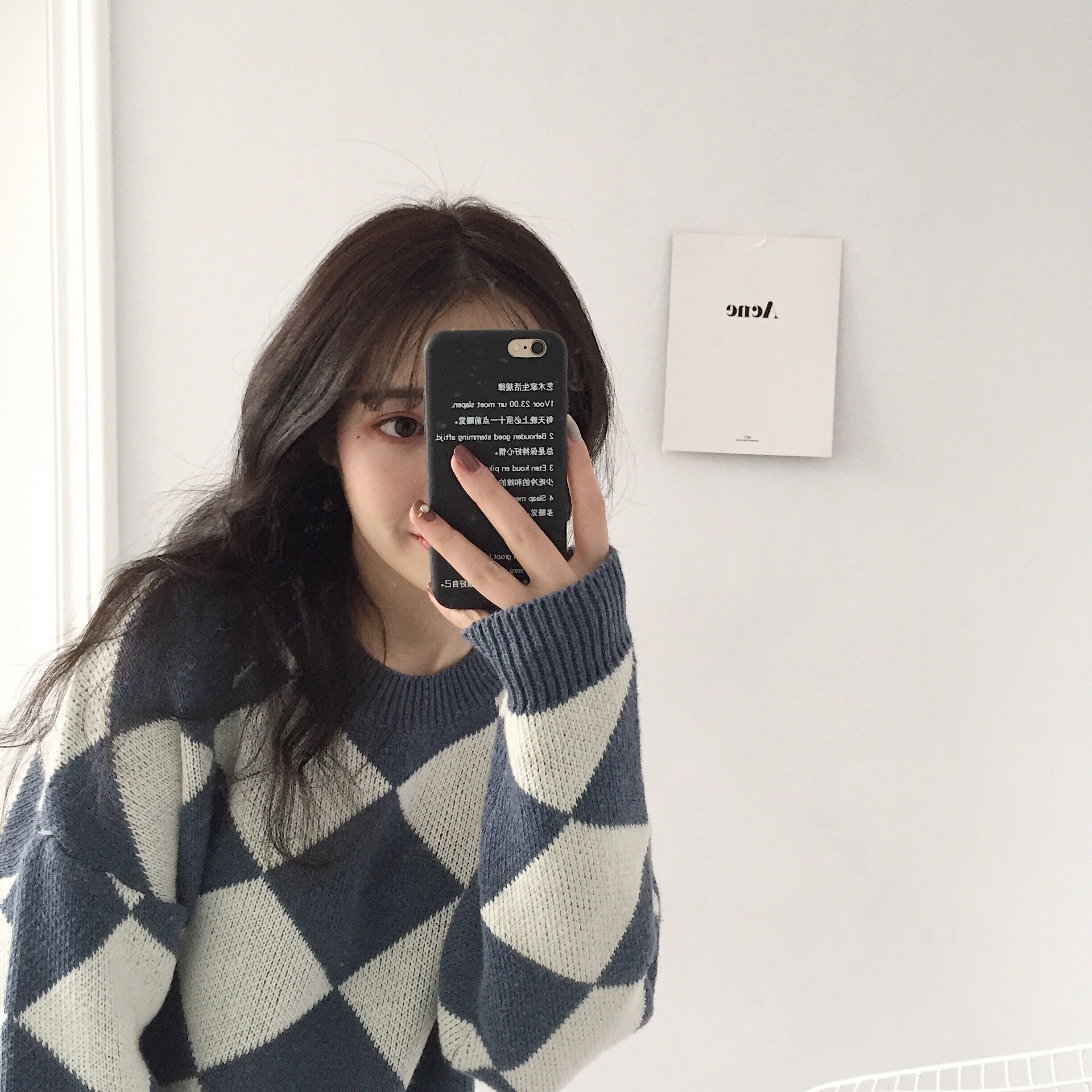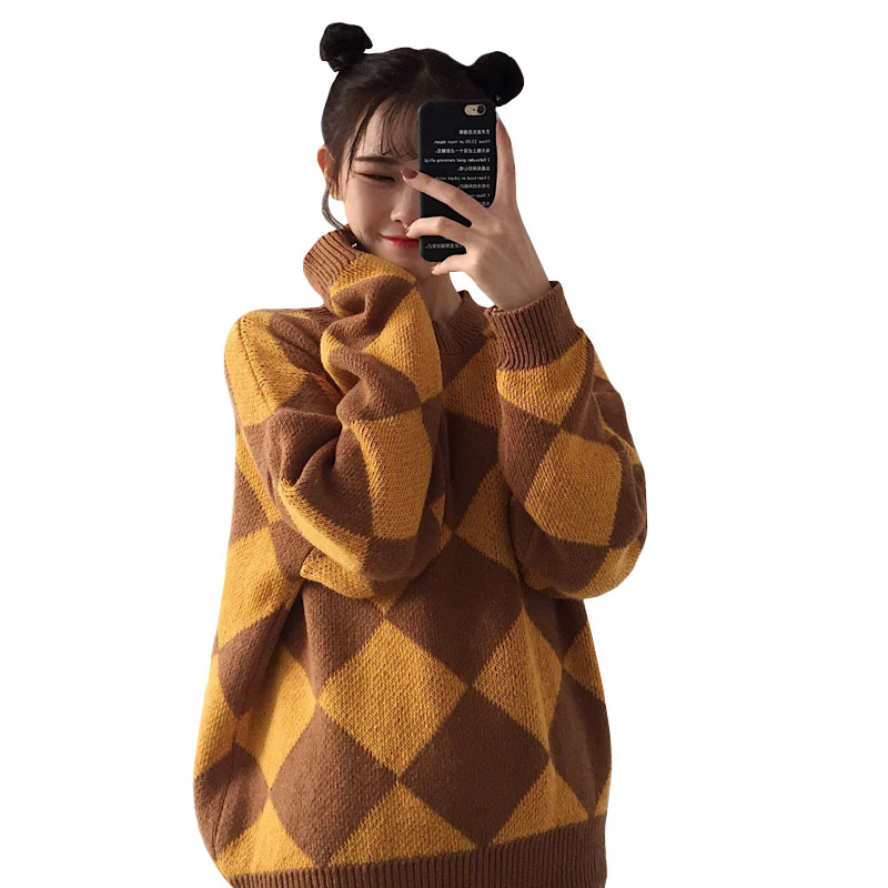 秋冬女裝韓版BF風寬松原宿風港味復古格子網紅套頭針織衫毛衣外套