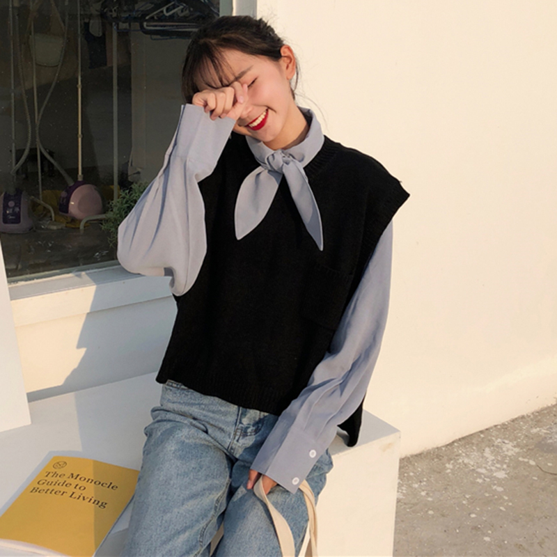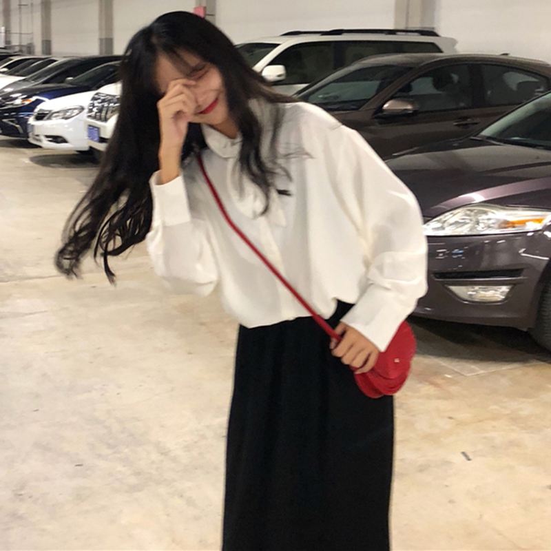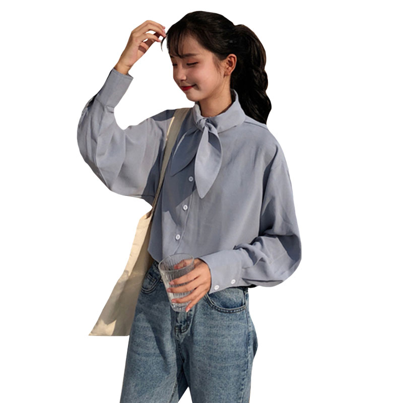 / 秋季韓版chic氣質小清新打結領長袖襯衫中長款寬松休閑襯衣上衣女
