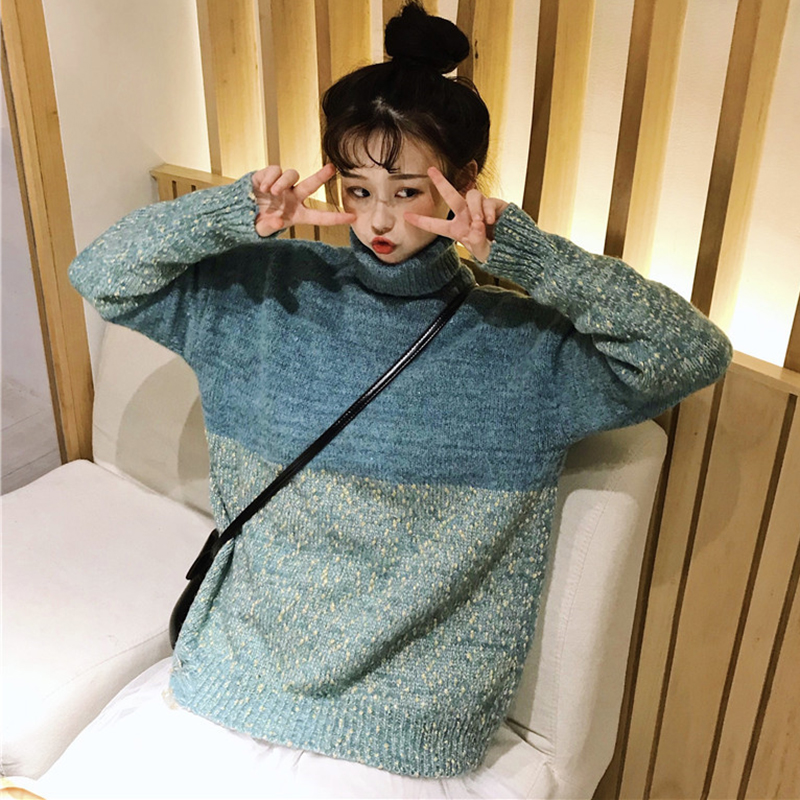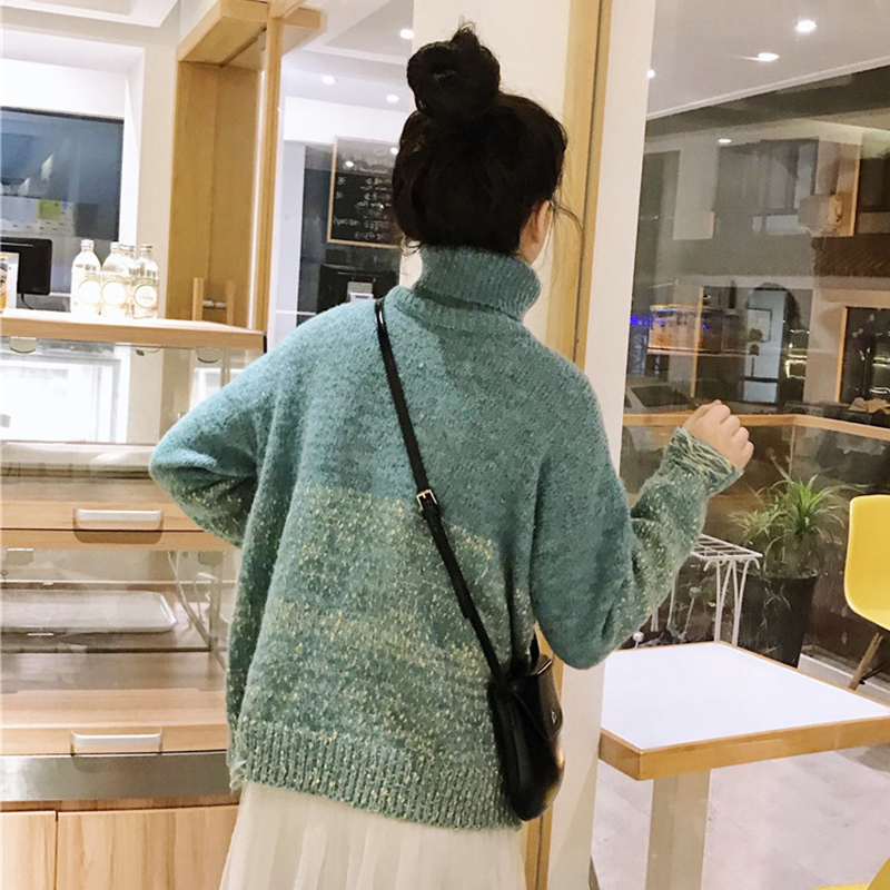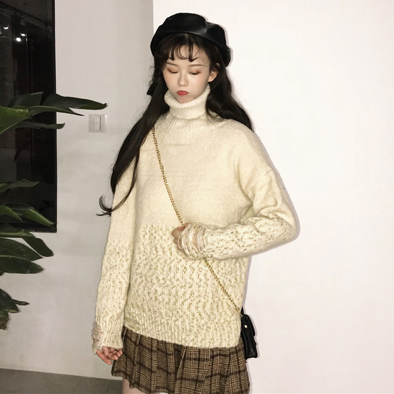 慵懶風拼色漸變毛衣外套女秋冬裝2018新款韓版寬松破洞高領針織衫