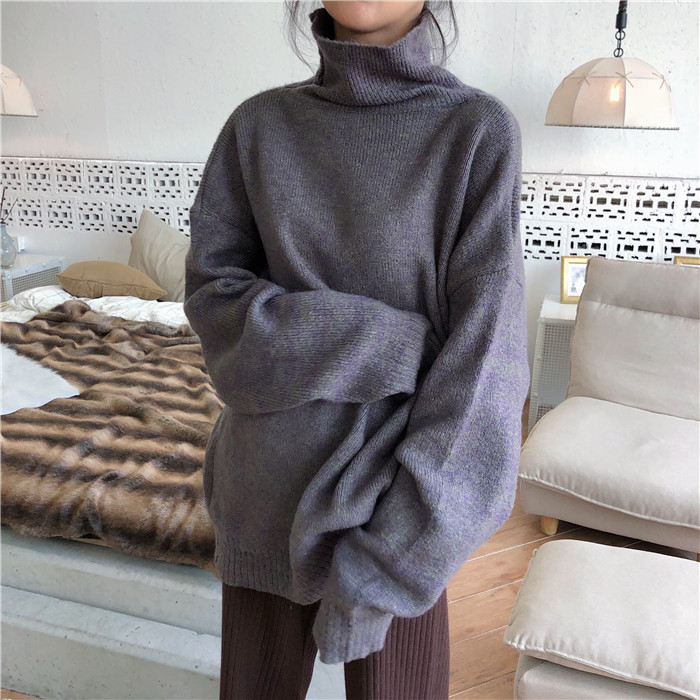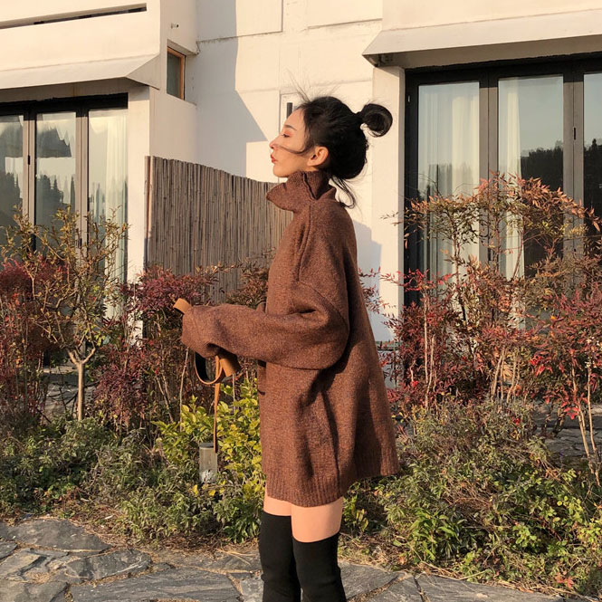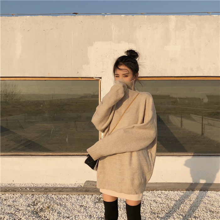 韓系早秋時尚網紅毛衣女2018新款寬松慵懶風加厚高領顯瘦遮臀毛衣