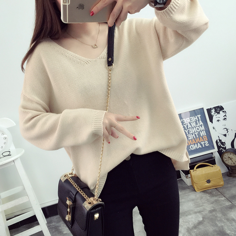 / 毛衣春秋新款套頭女寬松針織打底衫v領長袖薄款毛衣春裝百搭