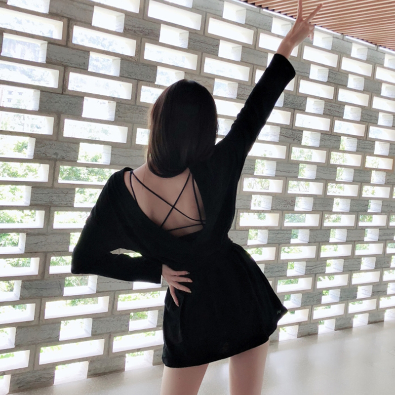 2018早秋新款女裝韓版綁帶收腰露肩長袖白T恤心機露背中長上衣潮