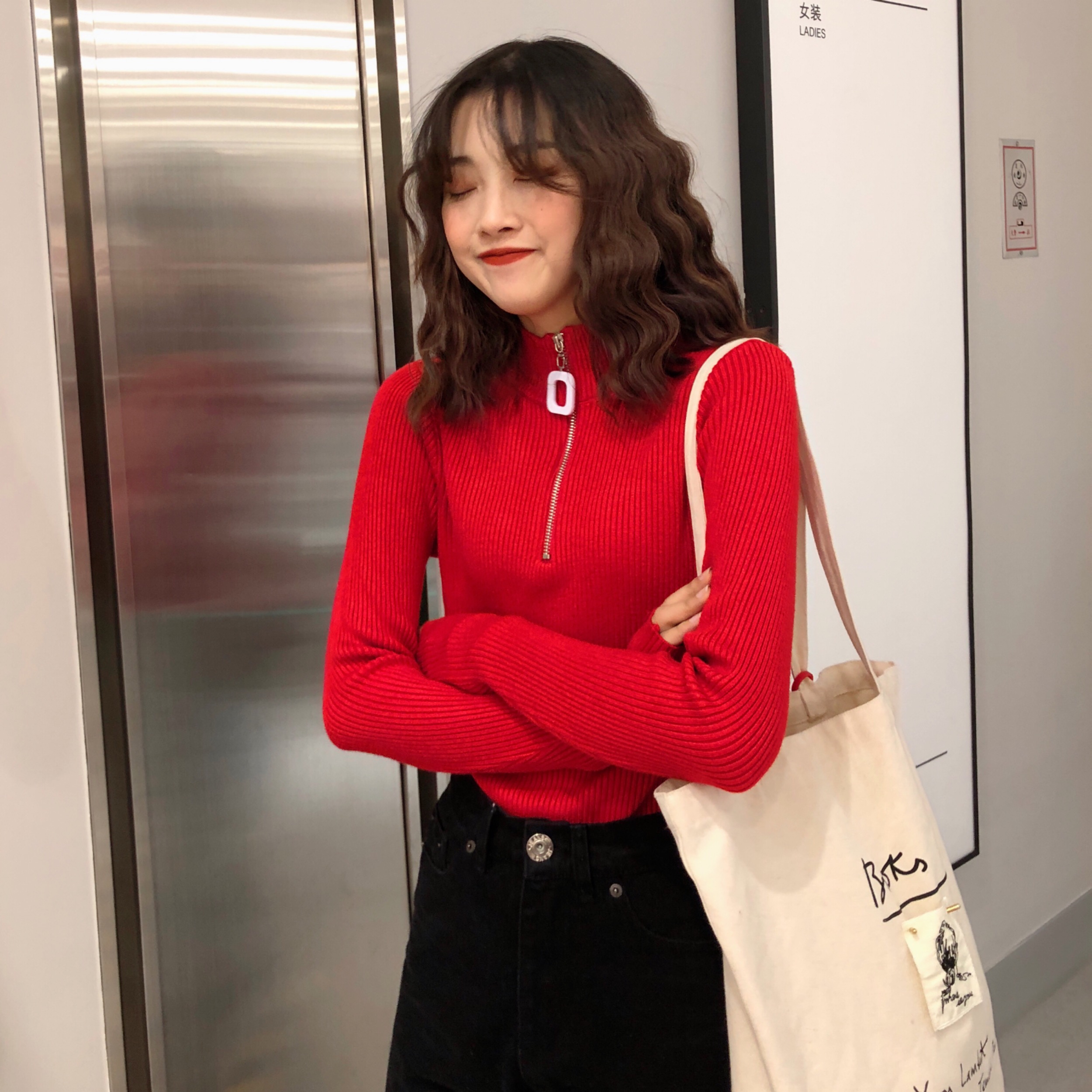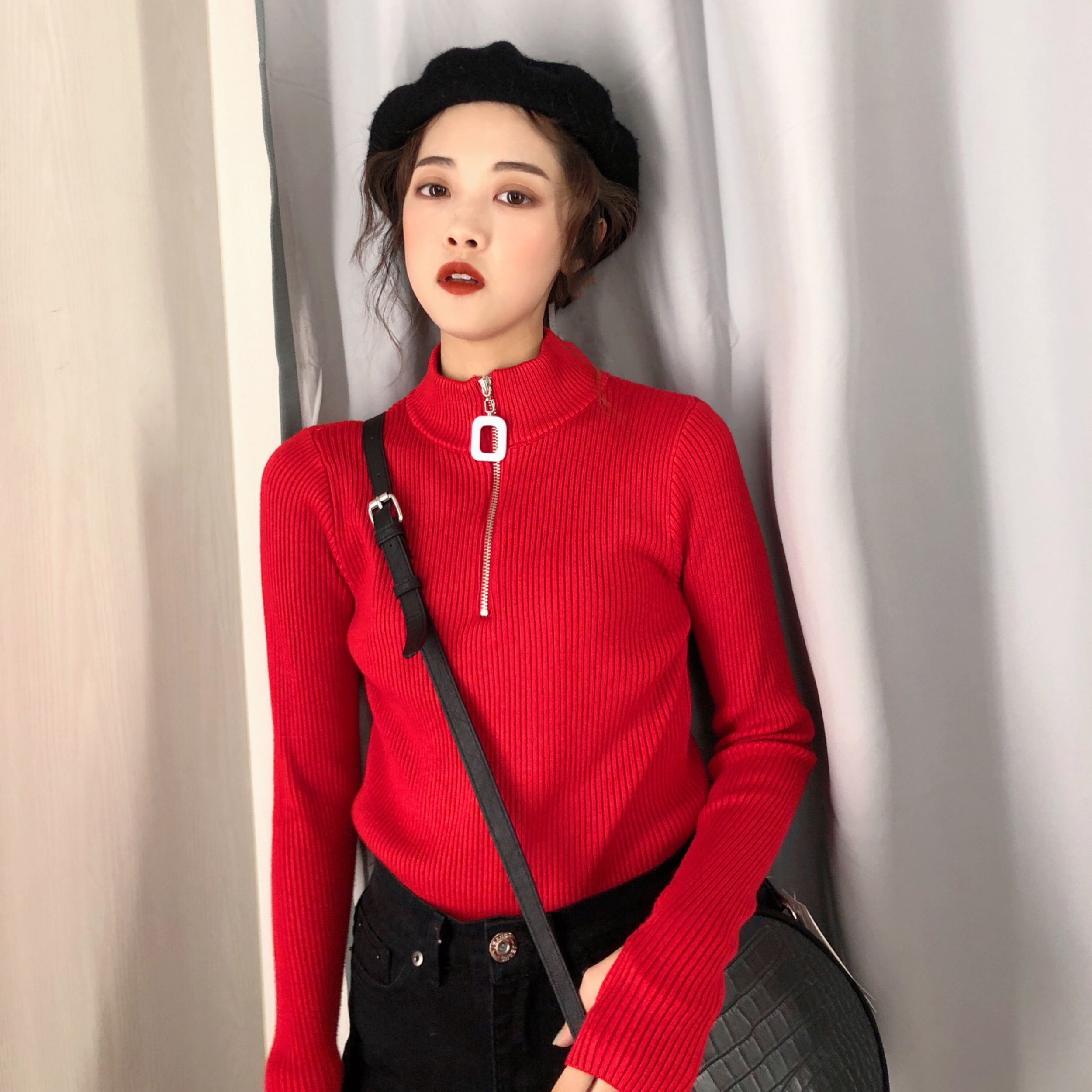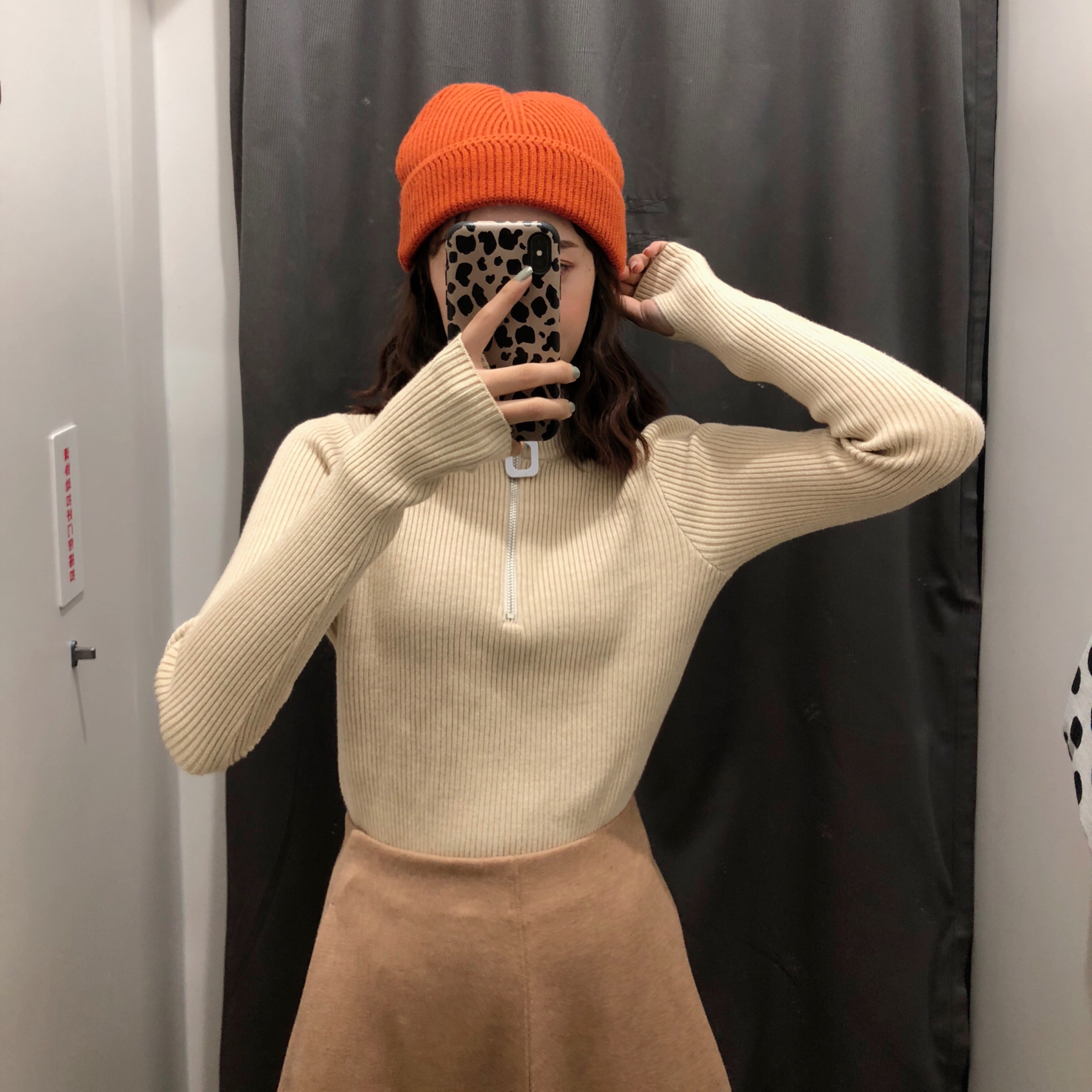 / 秋冬韓版純色修身顯瘦拉鏈半高領長袖打底衫套頭針織衫毛衣上衣女