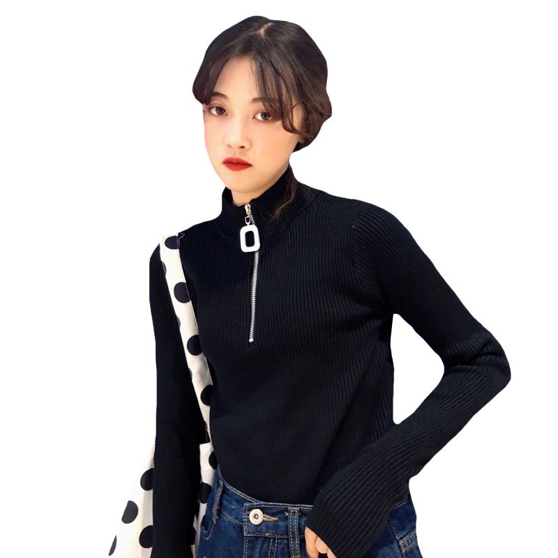 秋冬韓版純色修身顯瘦拉鏈半高領長袖打底衫套頭針織衫毛衣上衣女
