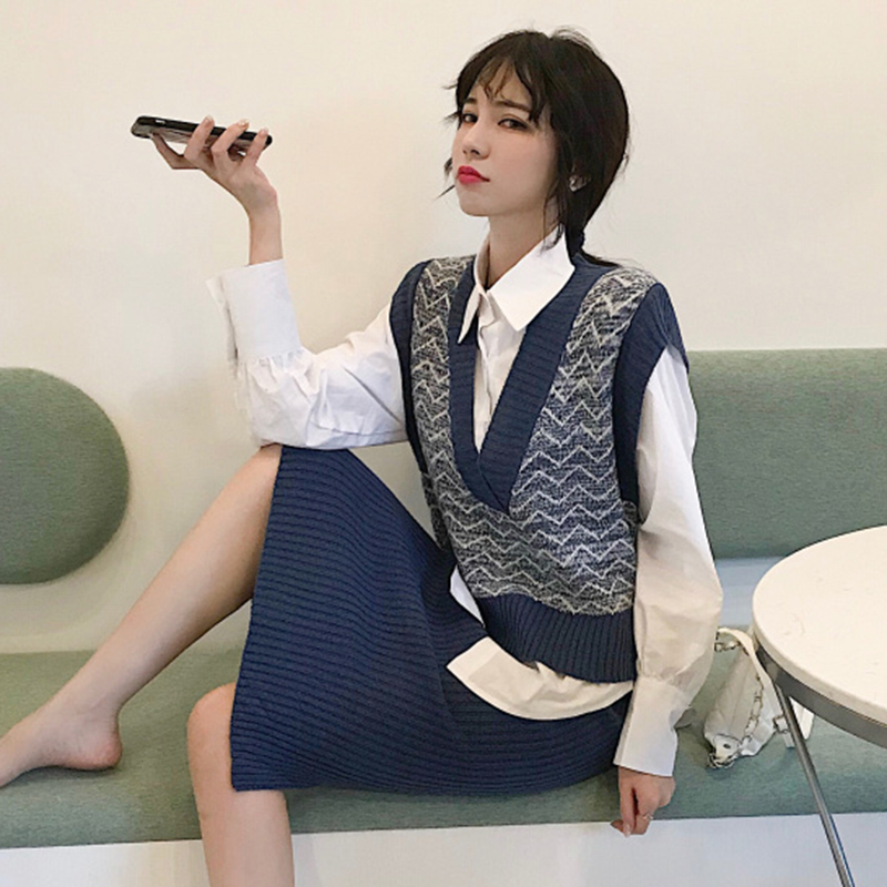 / 小香風套裝女秋2018新款寬松長袖白襯衫撞色馬甲高腰半身中長裙子