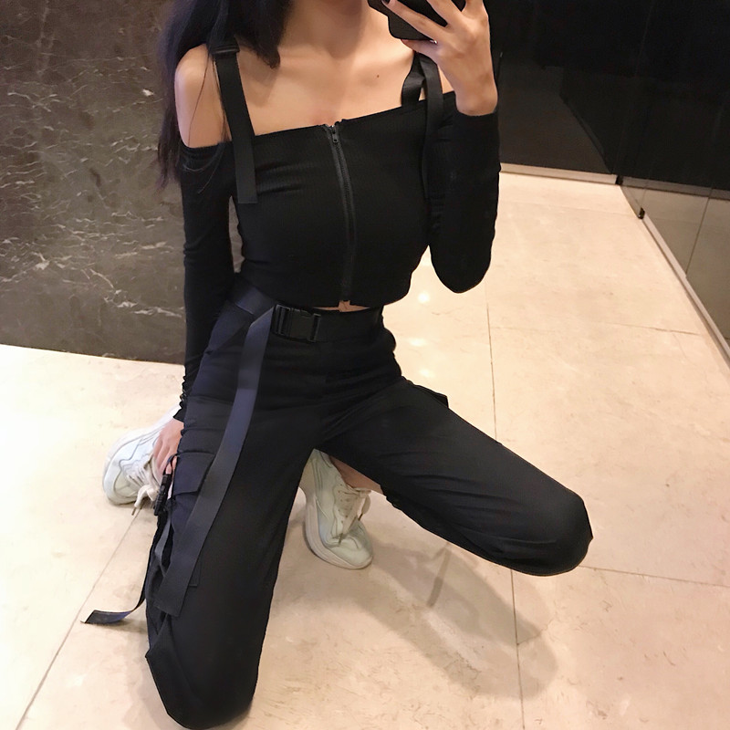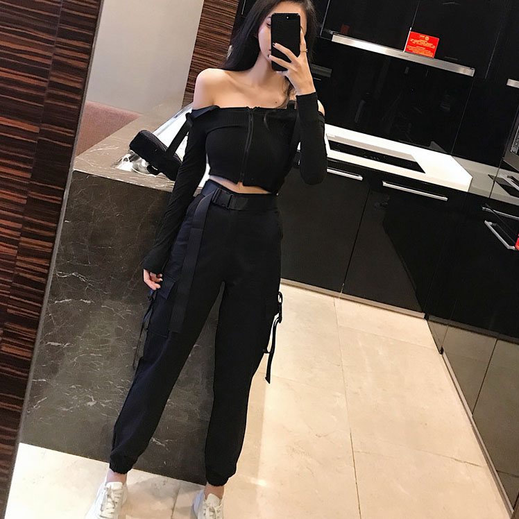 秋裝女2018新款高腰口袋嘻哈寬松束腳工裝褲+背帶露腰T恤女兩件套