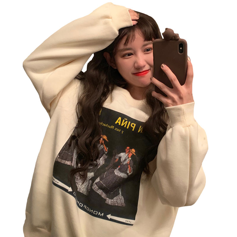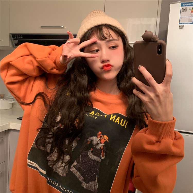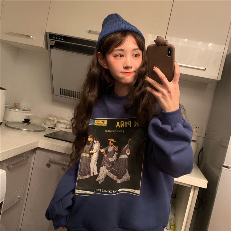 2018新款秋冬韓版寬松原宿風卡通字母貼圖加絨加厚衛衣上衣外套女