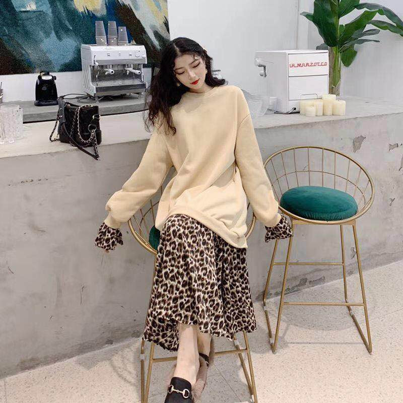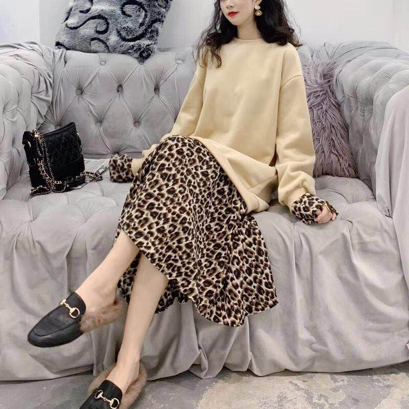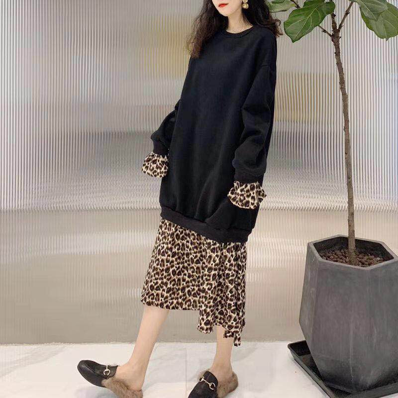 / chic加絨百搭衛衣女秋冬2018新款氣質拼接豹紋假兩件過膝連衣裙女