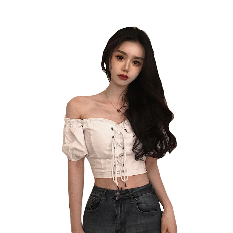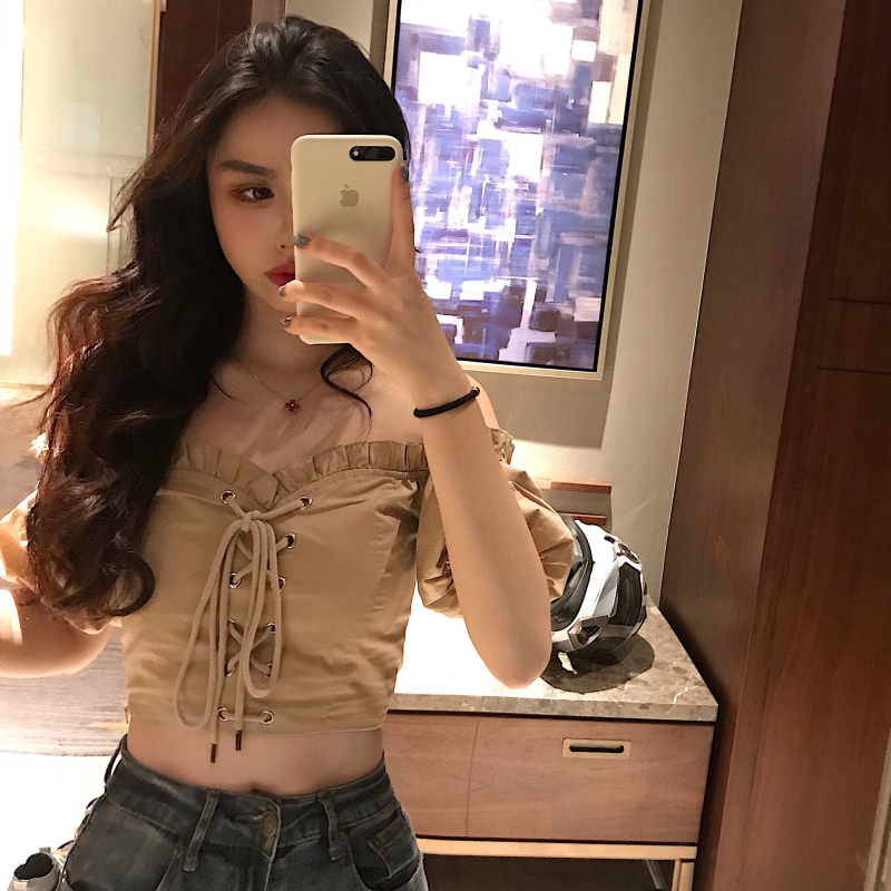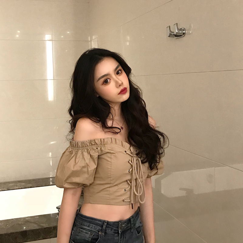 秋裝女2018新款宮廷復古一字領露肩系帶短款泡泡袖高腰襯衫上衣潮