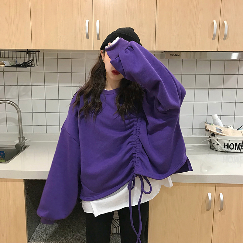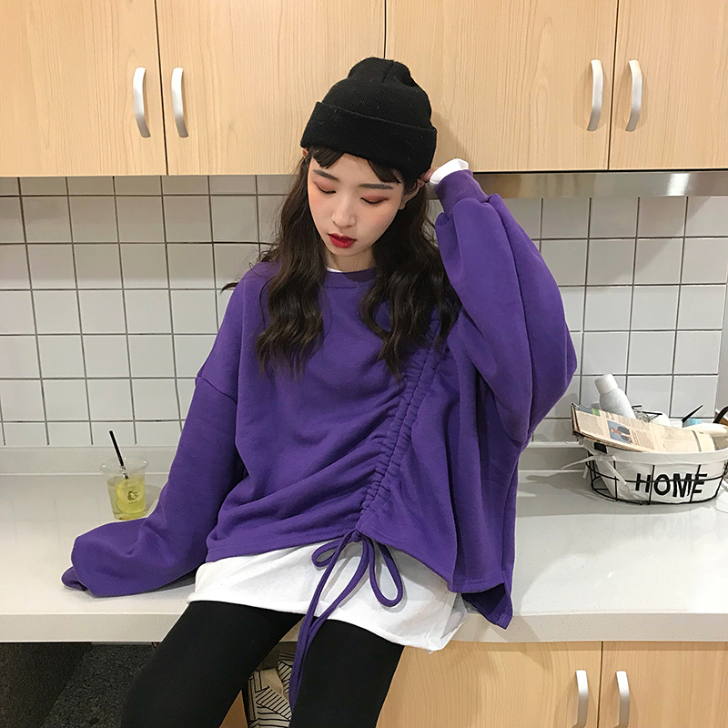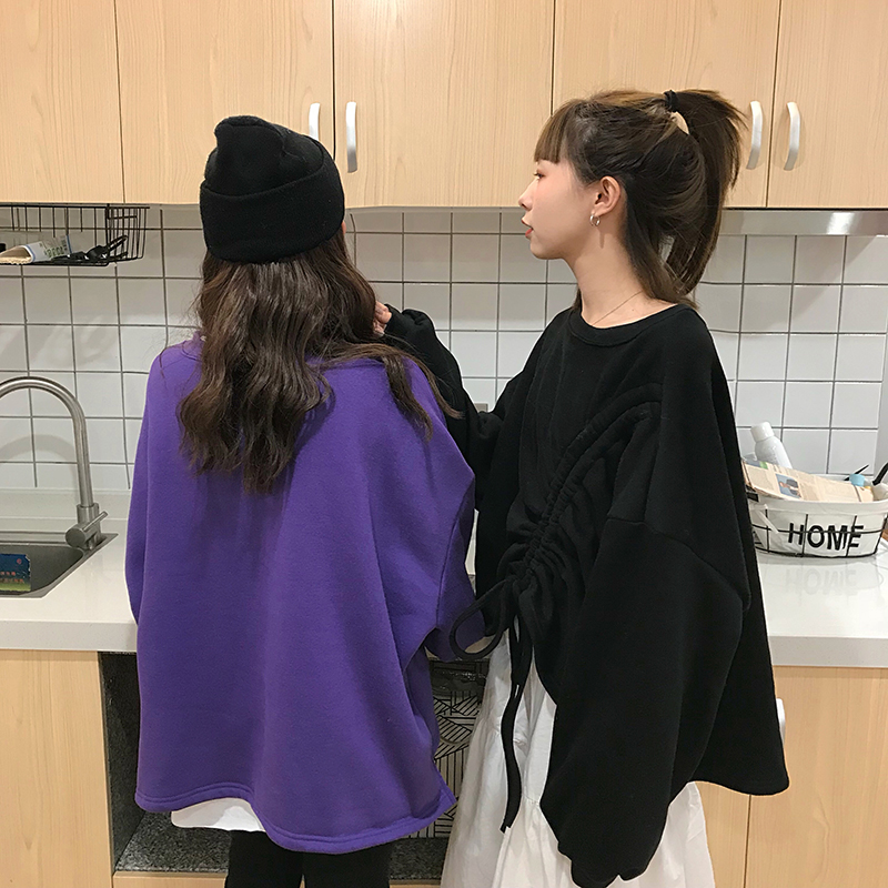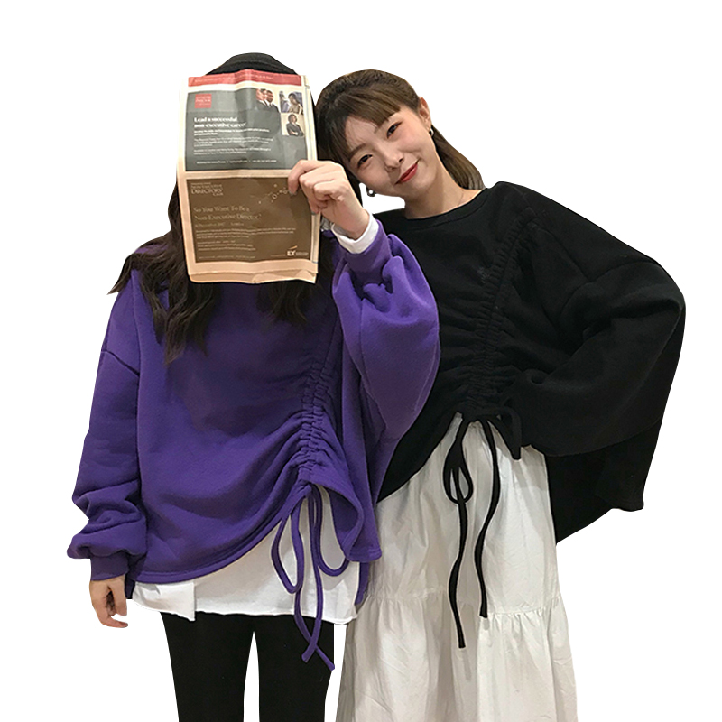 2018新款秋冬女裝韓版寬松閨蜜裝純色不規則系帶套頭衛衣上衣外套