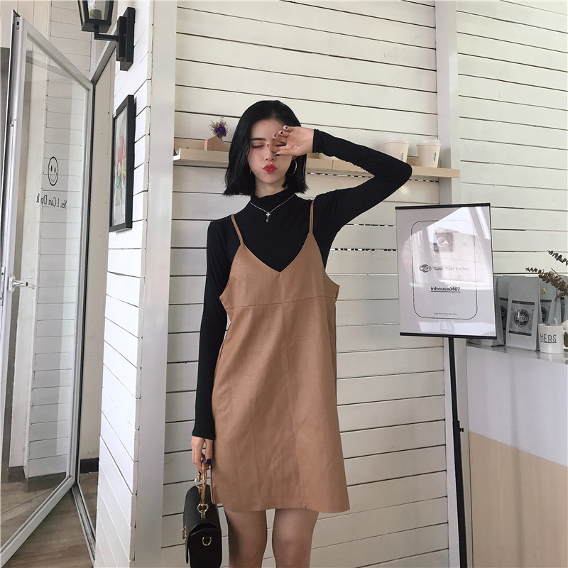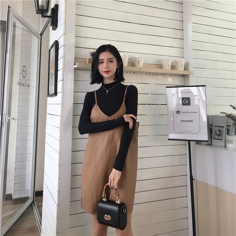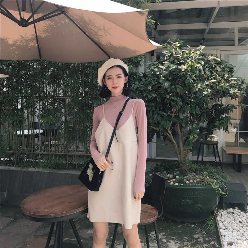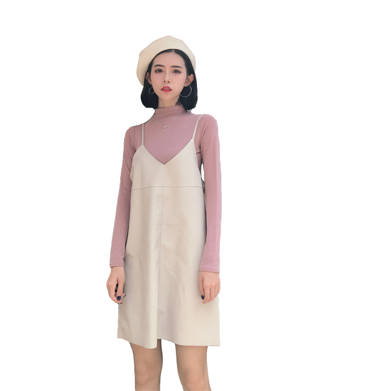秋裝女2018新款套裝時尚兩件套修身打底衫+無袖吊帶皮裙分開拍