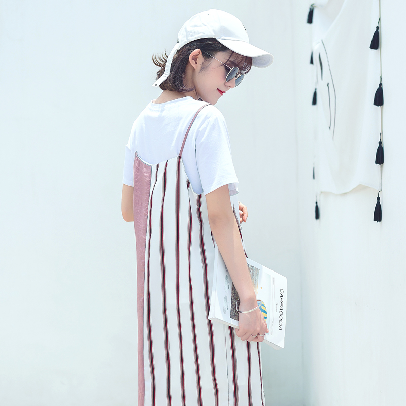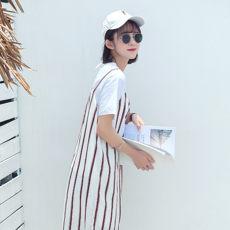 / 夏裝新款女裝韓版甜美不規則寬松連衣裙外搭拼接條紋學生裙子