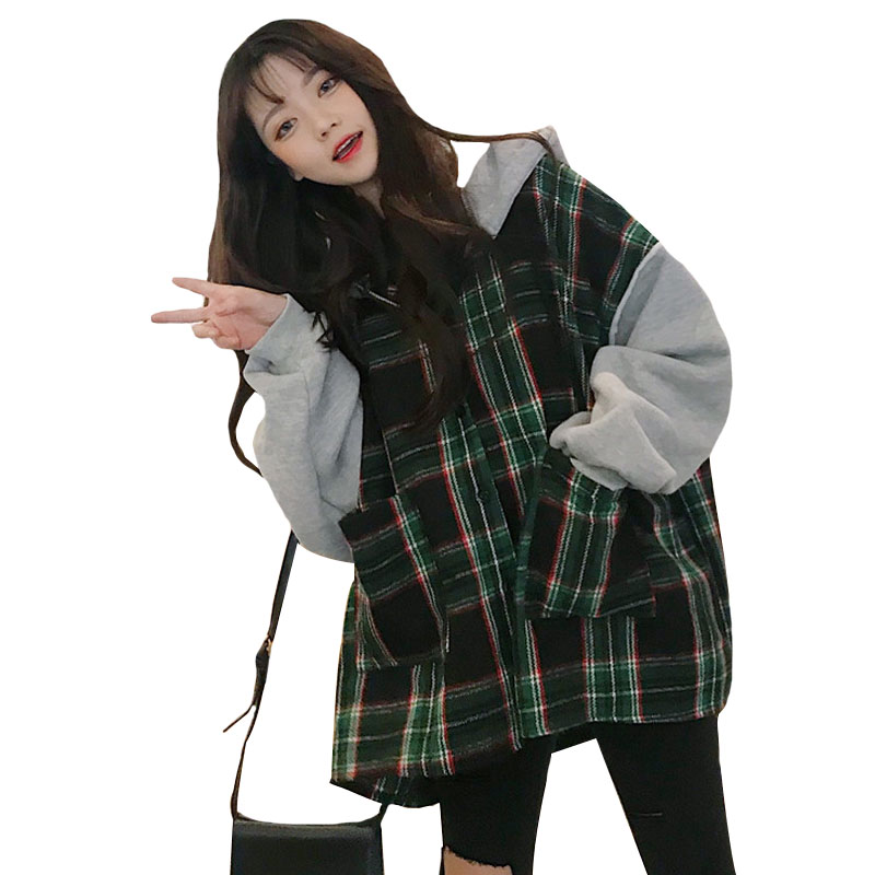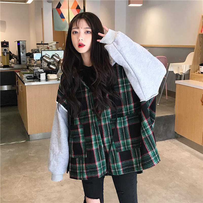 / 秋季女裝韓版中長款格子拼接假兩件連帽套頭衛衣寬松長袖上衣外套
