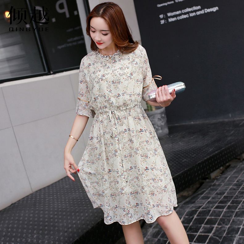 / 傾越2017新款春夏韓版小碎花雪紡連衣裙中長款顯瘦長袖圓領百褶裙
