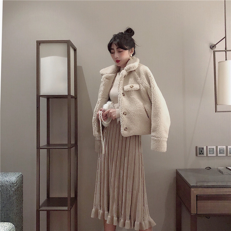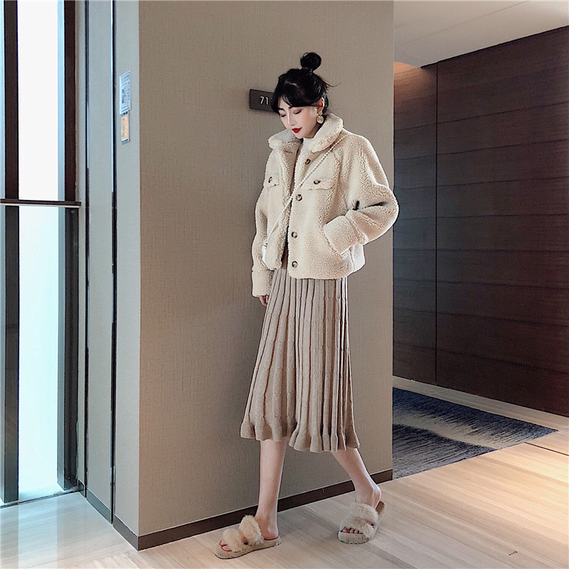 / 娃娃領chic毛茸茸外套秋冬短款時尚套裝復古顯瘦百褶裙子兩件套女