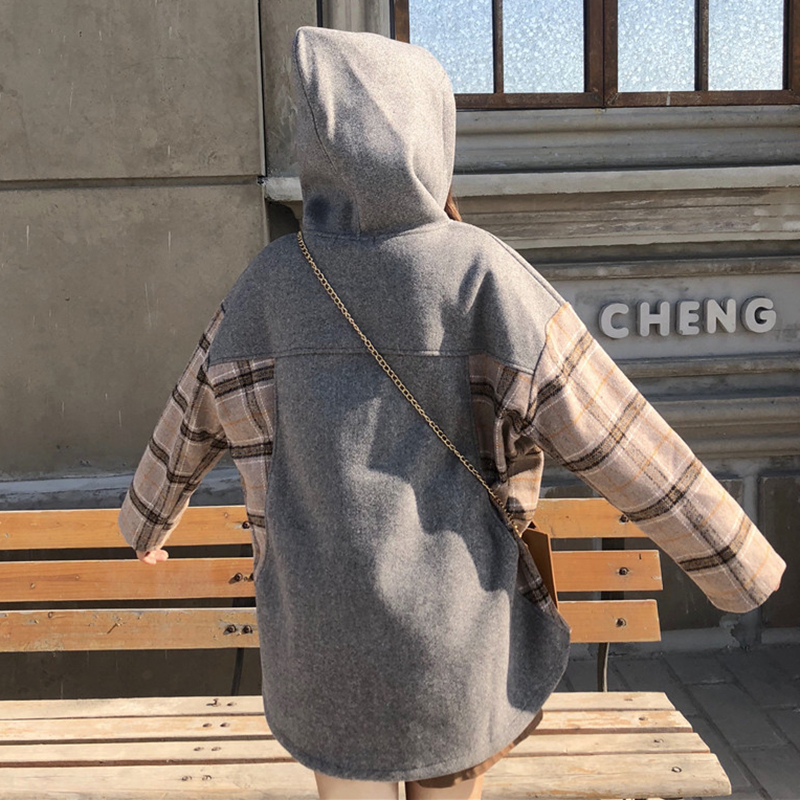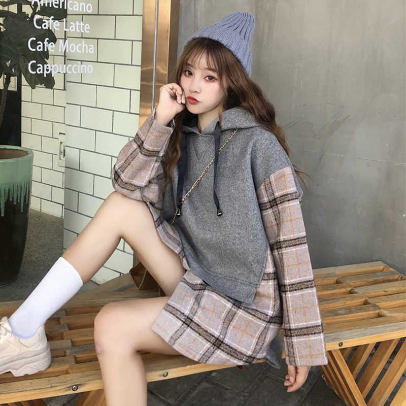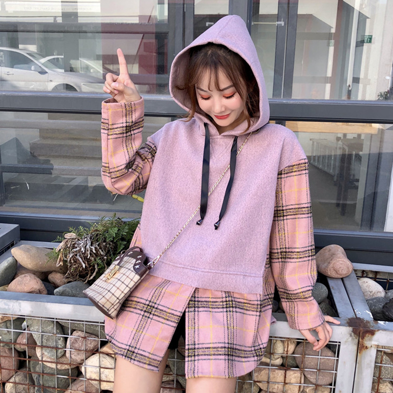 秋冬女裝2018新款學生格子假兩件衛衣寬松長袖連帽外套時尚上衣潮