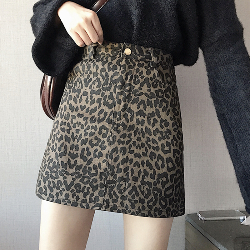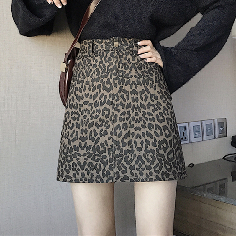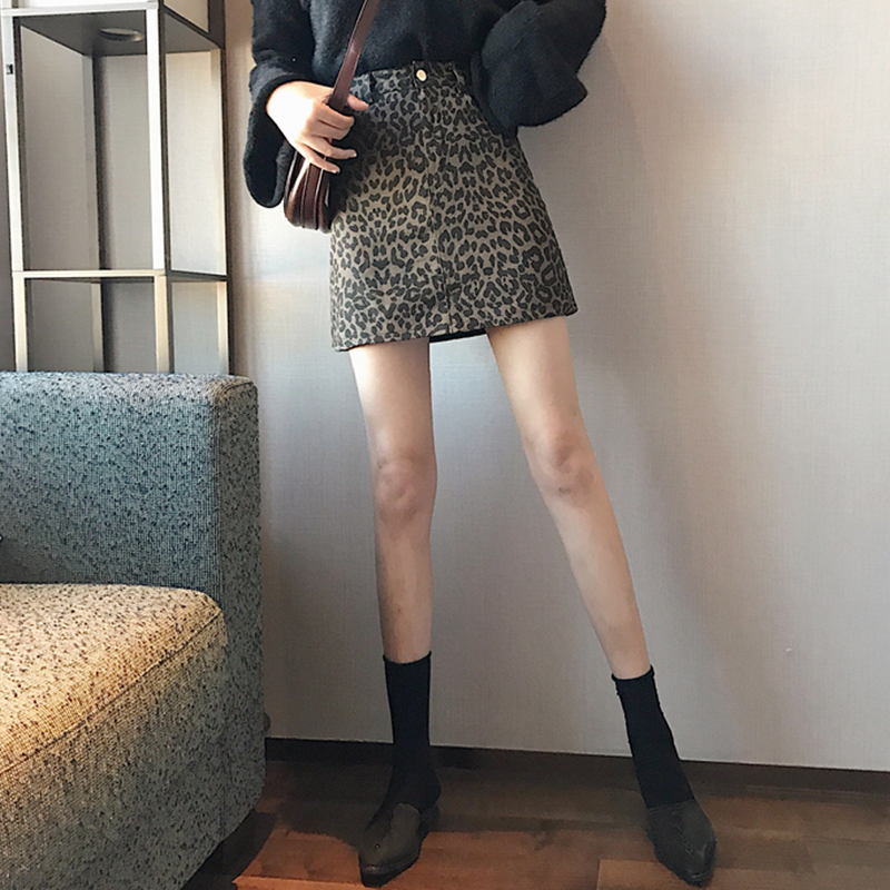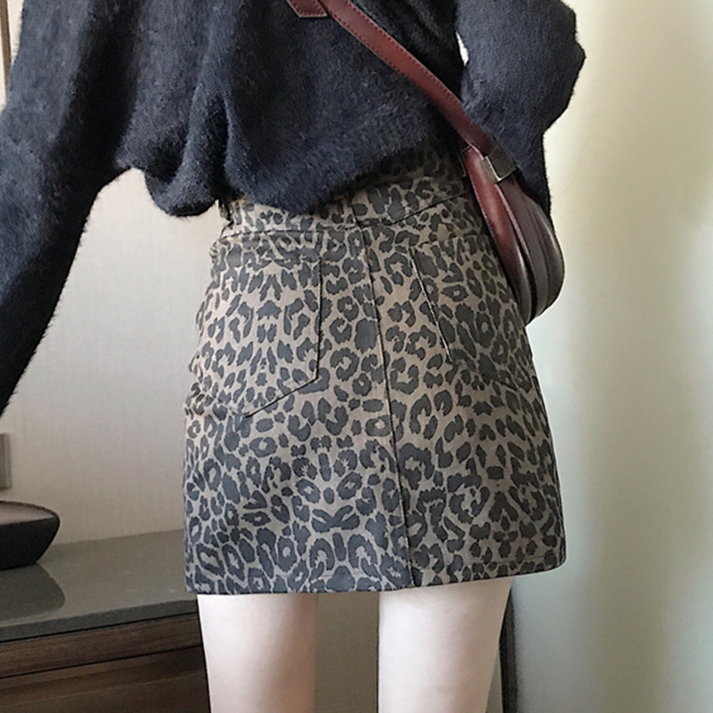 / 時尚豹紋牛仔半身裙子女秋冬裝新款韓版學生復古高腰顯瘦A字短裙
