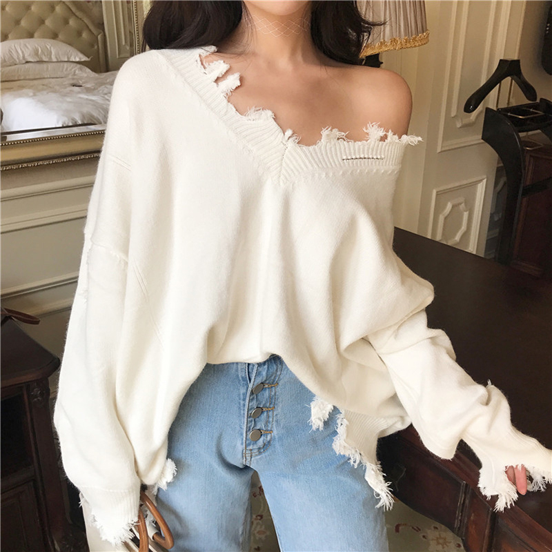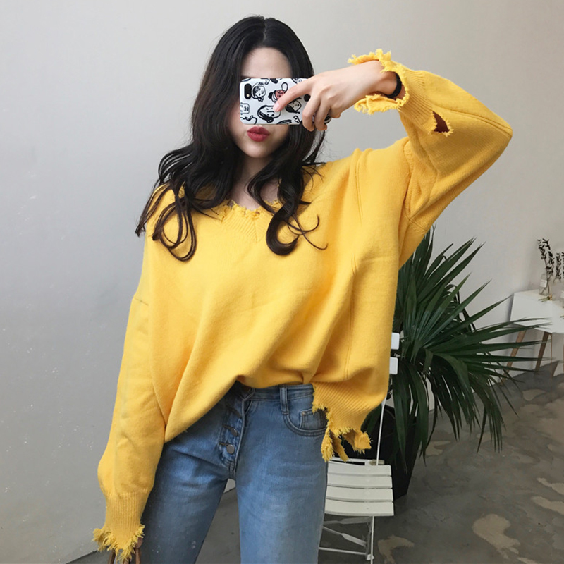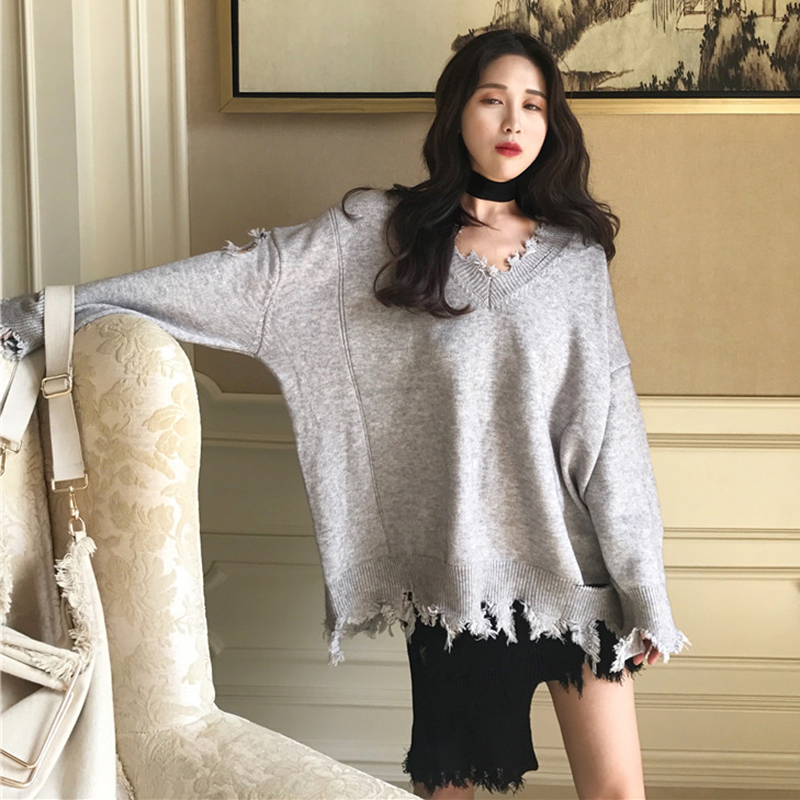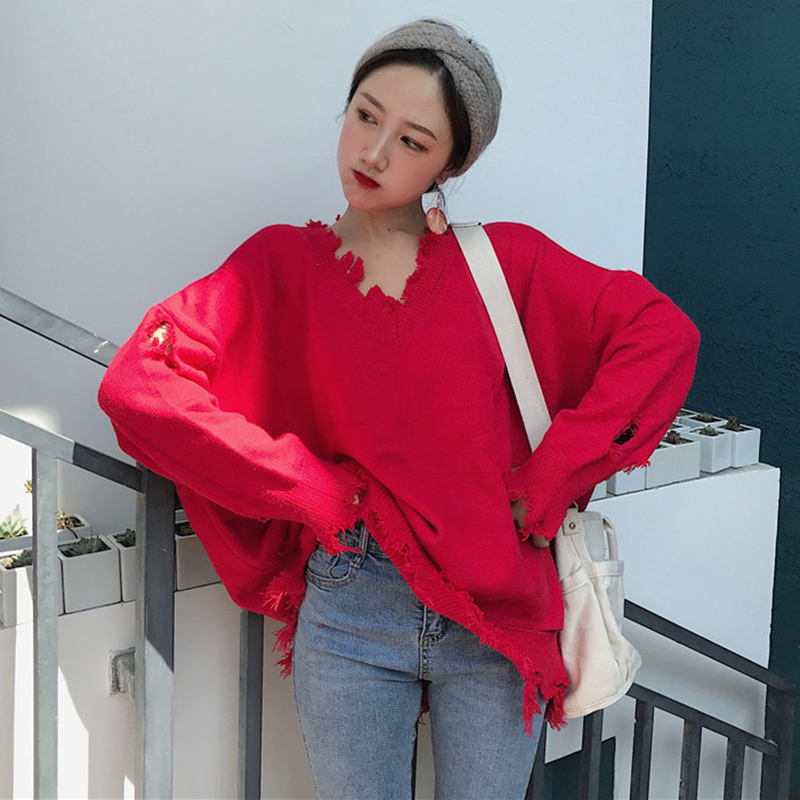 / 秋裝破爛毛邊針織打底衫2018新款女慵懶套頭毛衣寬松V領長袖上衣