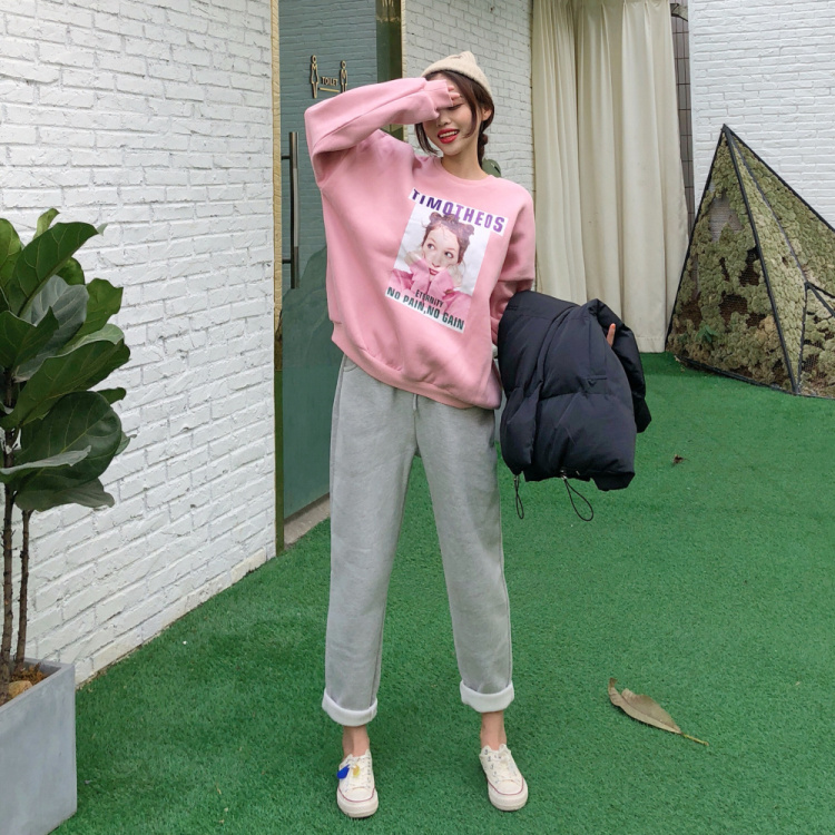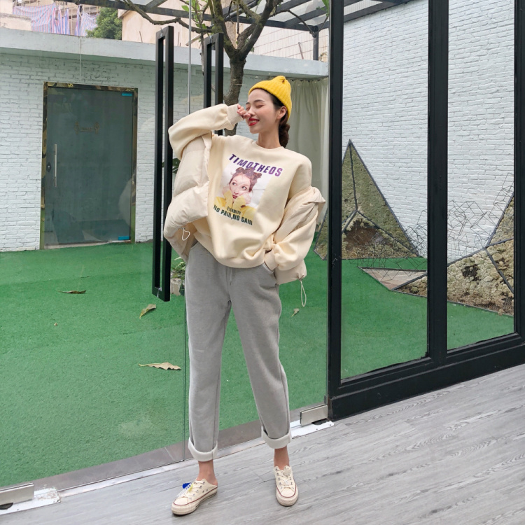 字母拼接針織燈籠袖衛衣女秋冬2018新款+高腰燈芯絨加絨蘿卜褲潮