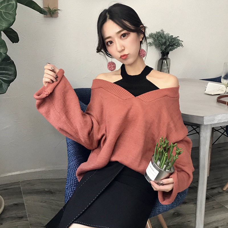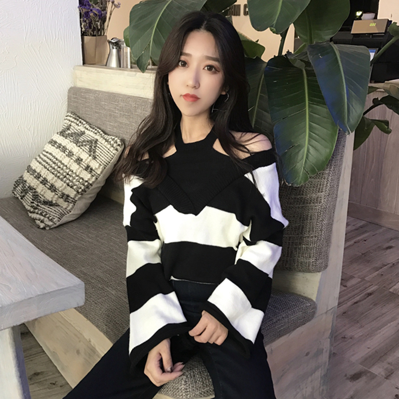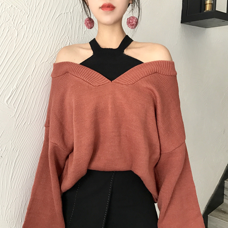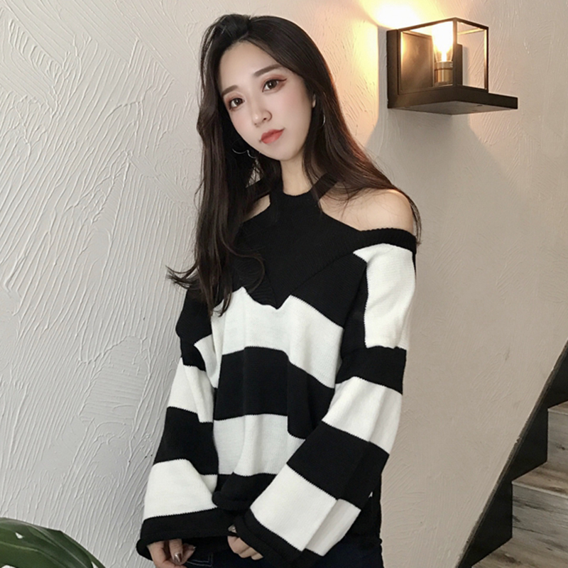/ 假兩件冷系上衣秋裝女新款港味復古掛脖拼接寬松長袖條紋針織毛衣