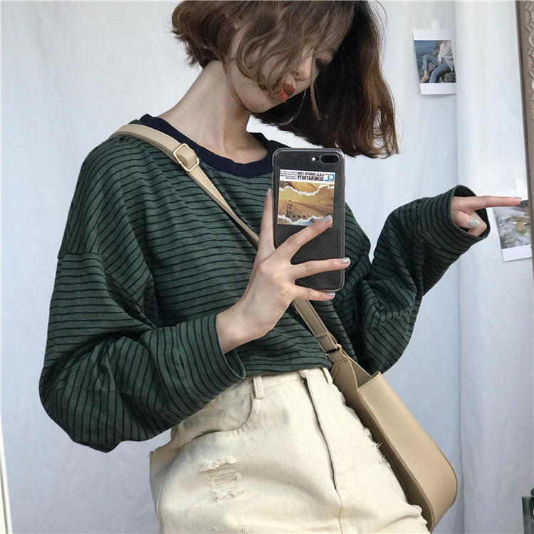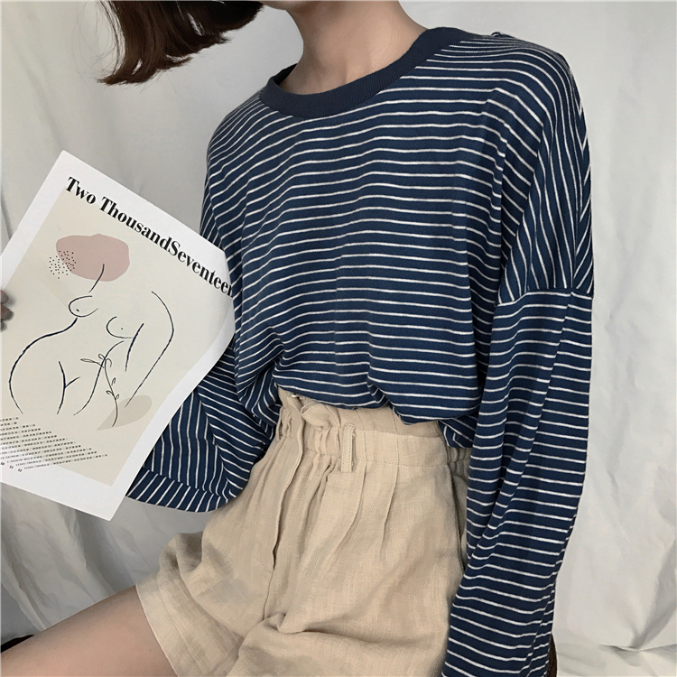 秋裝女裝韓版復古寬松長袖針織衫百搭圓領顯瘦條紋T恤打底衫上衣