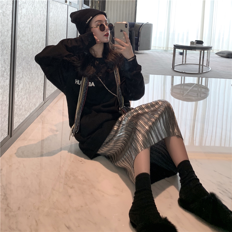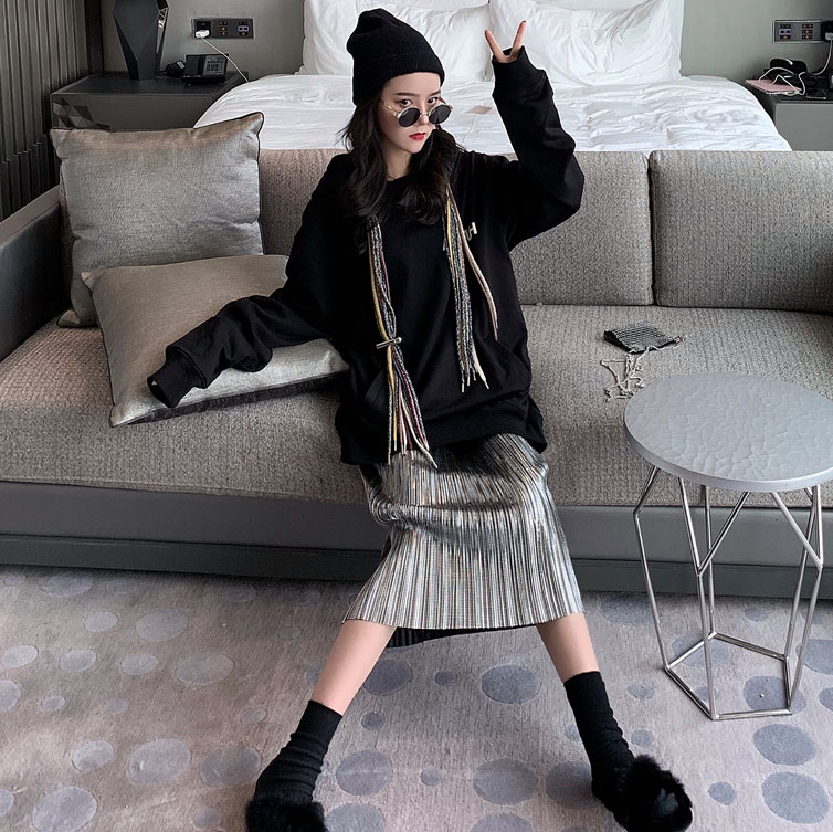 黑色衛衣|壓褶半裙