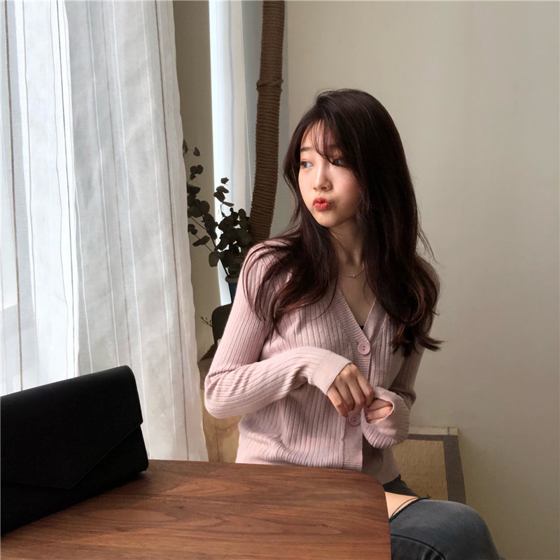 chic早秋上衣慵懶寬松顯瘦純色長袖V領針織衫開衫外套女韓版新款