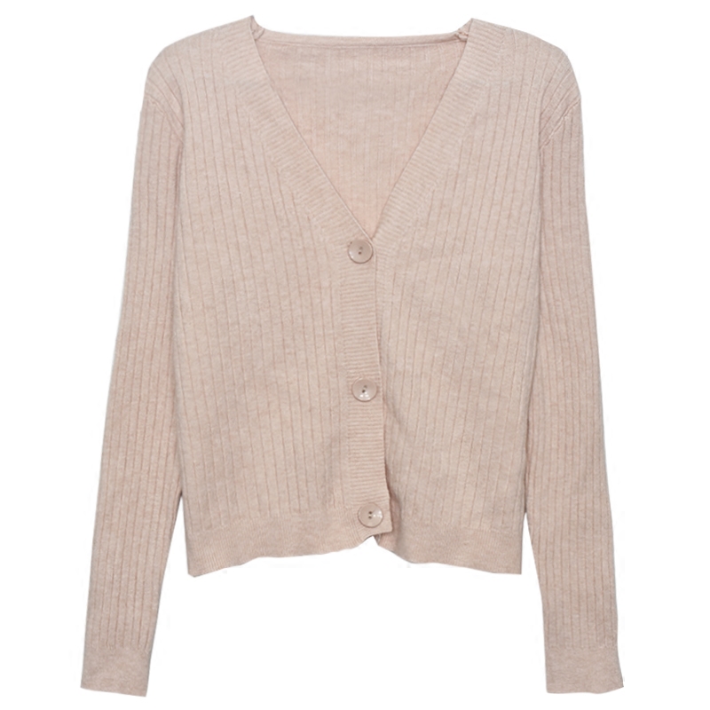韓版chic早秋慵懶溫柔毛衣坑條V領一排扣喇叭袖純色百搭針織開衫