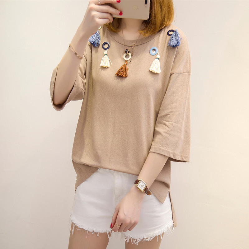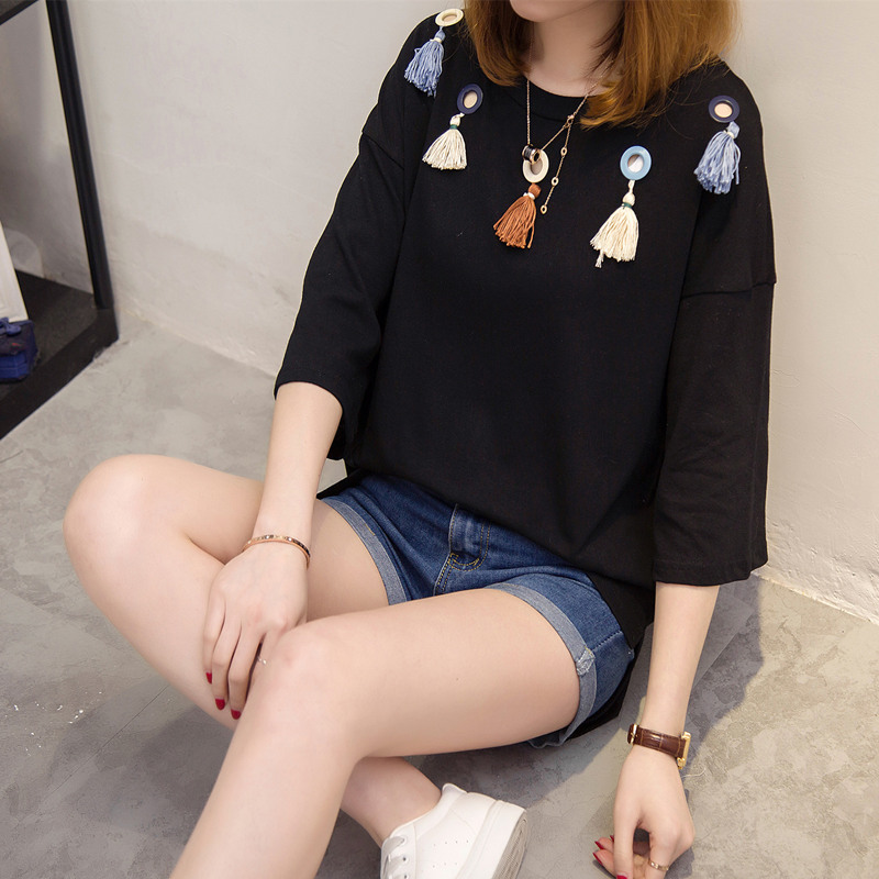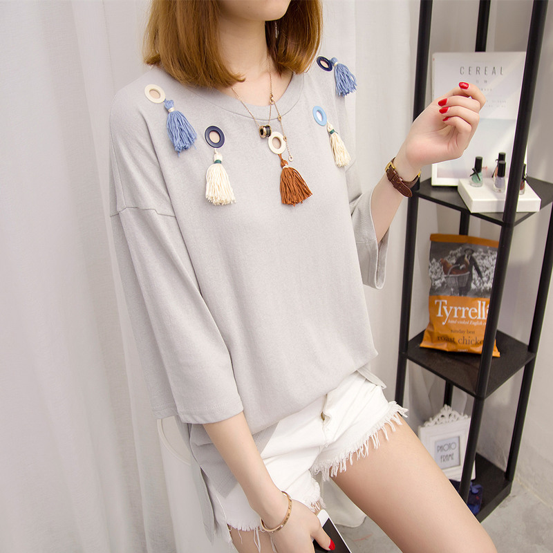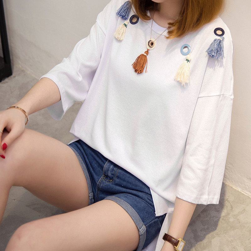 / 短袖上衣女夏新款寬松t恤女中長袖韓版鏤空流蘇打底體恤百搭