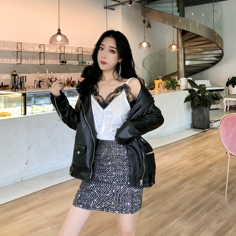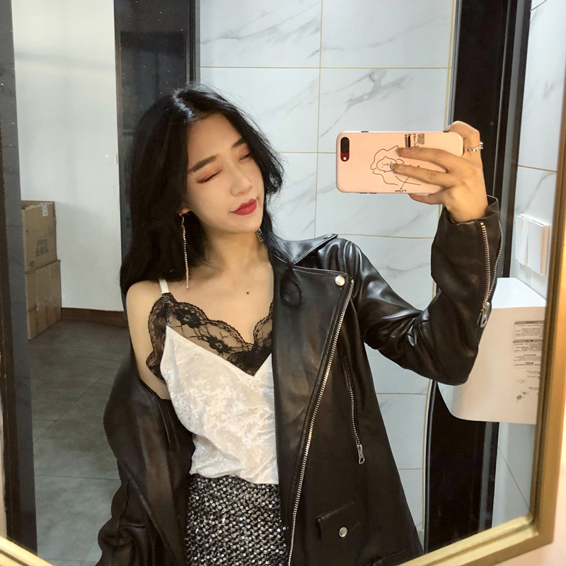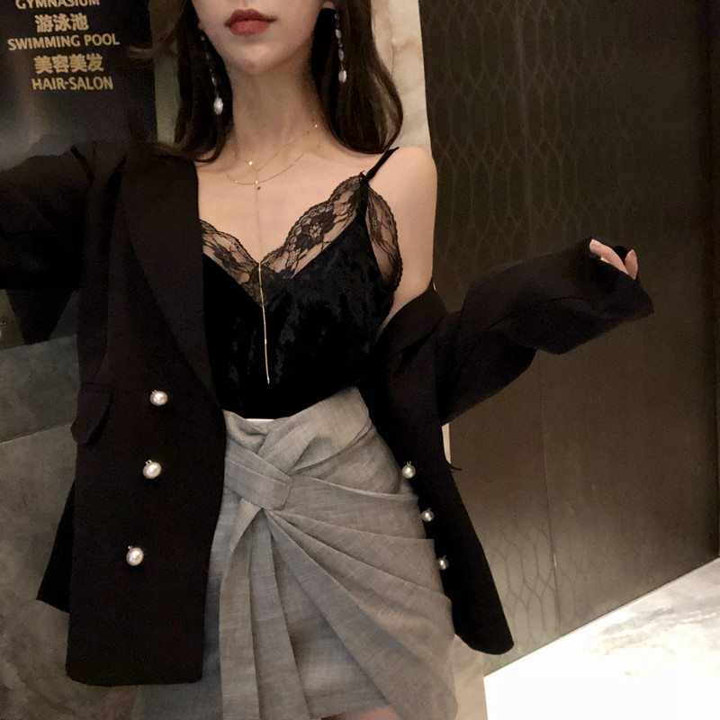秋裝女2018新款套裝小心機吊帶背心V領性感露肩蕾絲上衣+西裝外套
