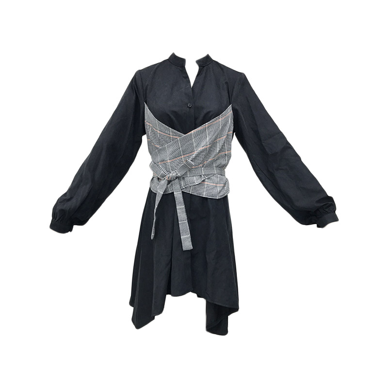 / 秋裝女2018新款氣質百搭收腰顯瘦假兩件格子拼接交叉系帶連衣裙潮