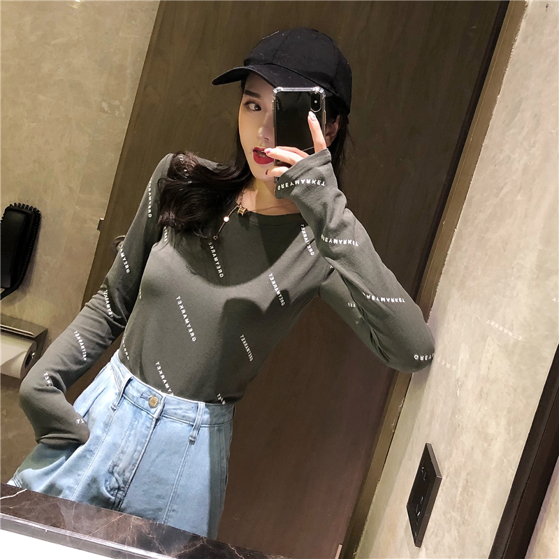chic早秋上衣女新款韓版T恤時尚字母印花高彈修身顯瘦長袖打底衫