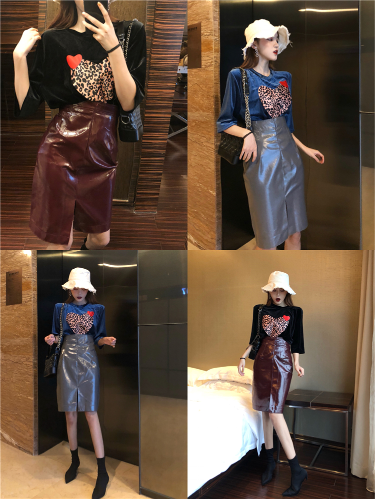 / 2018秋季新款港風街頭搖滾絲絨短袖T恤復古中長款亮皮裙時尚套裝