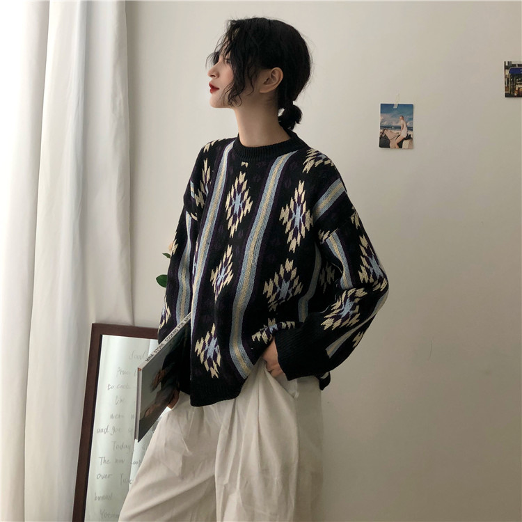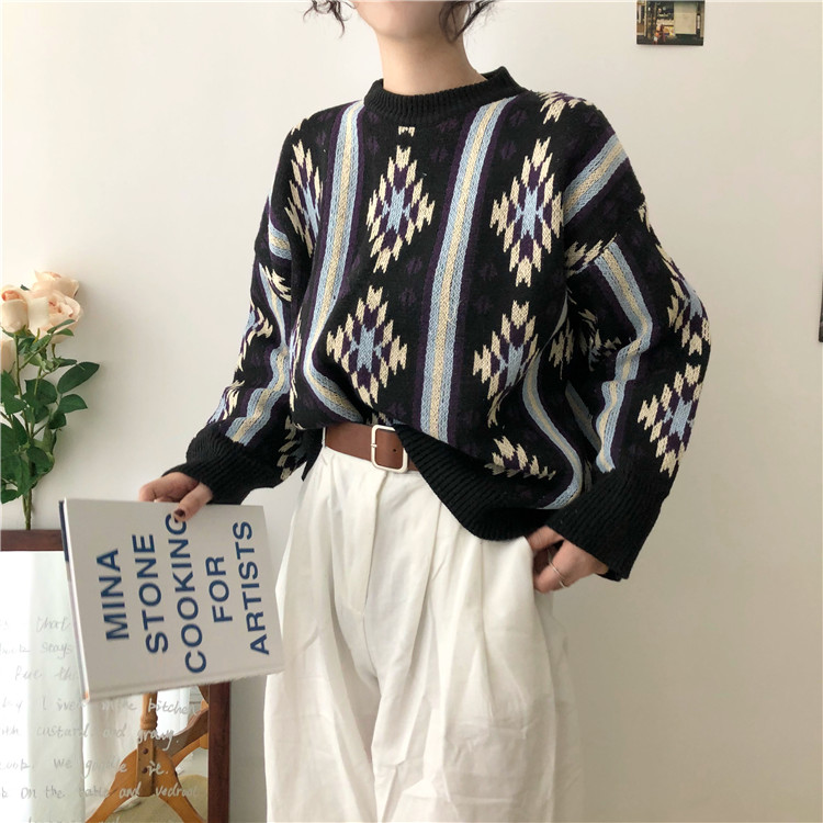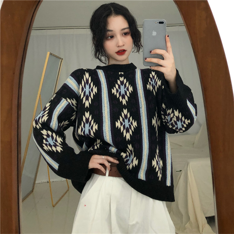 秋裝女2018新款港味復古圖案提花毛衣慵懶寬松長袖針織衫打底上衣