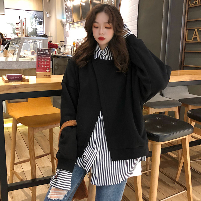 秋冬女裝2018新款韓版寬松假兩件條紋襯衣拼接加絨套頭衛衣外套潮